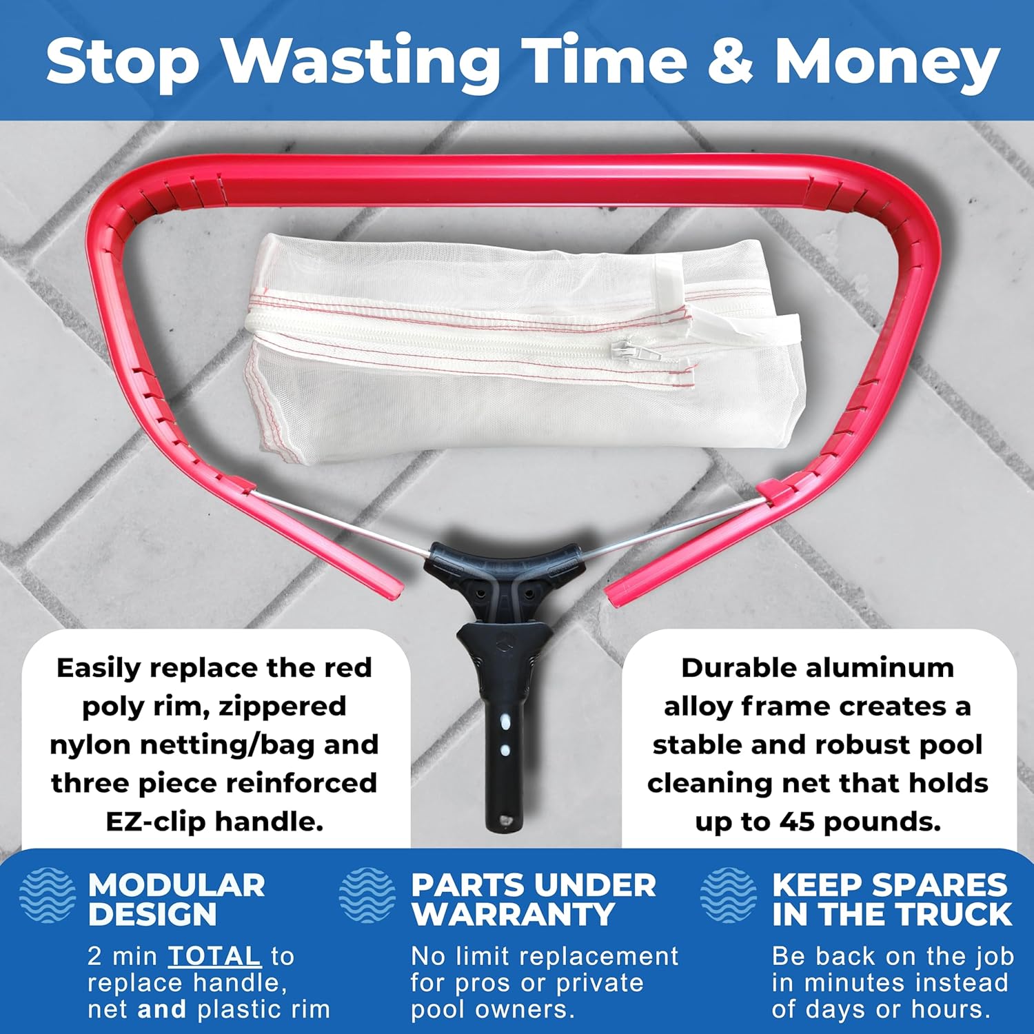 - NEARLY ELIMINATE DOWNTIME DUE TO BROKEN TOOLS - Keep an unlimited number of your fine mesh pool silt net part replacements (handles, nets, rims) in your truck (all at half off retail) for quick and easy on-site tool repairs. Stay on the job, making money and working hard for your clients.