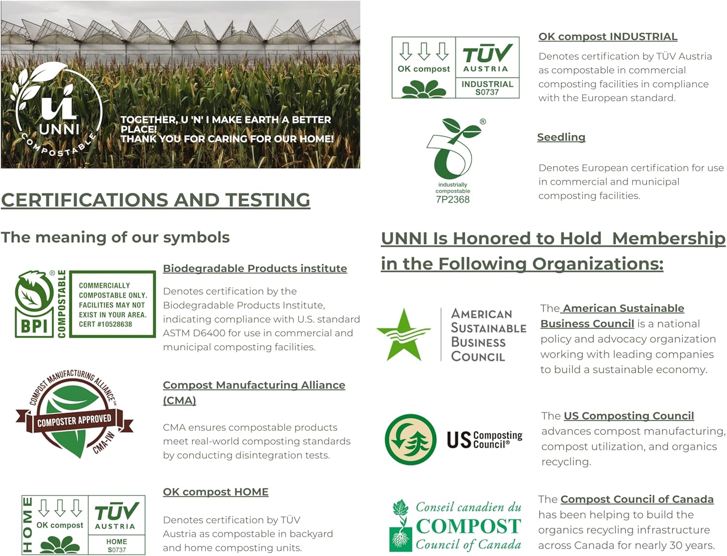 - Certified Compostable β Independently certified by BPI (U.S., to ASTM D6400), CMA (field-tested in operating facilities), and OK compost HOME by TΓV AUSTRIA (home/backyard).