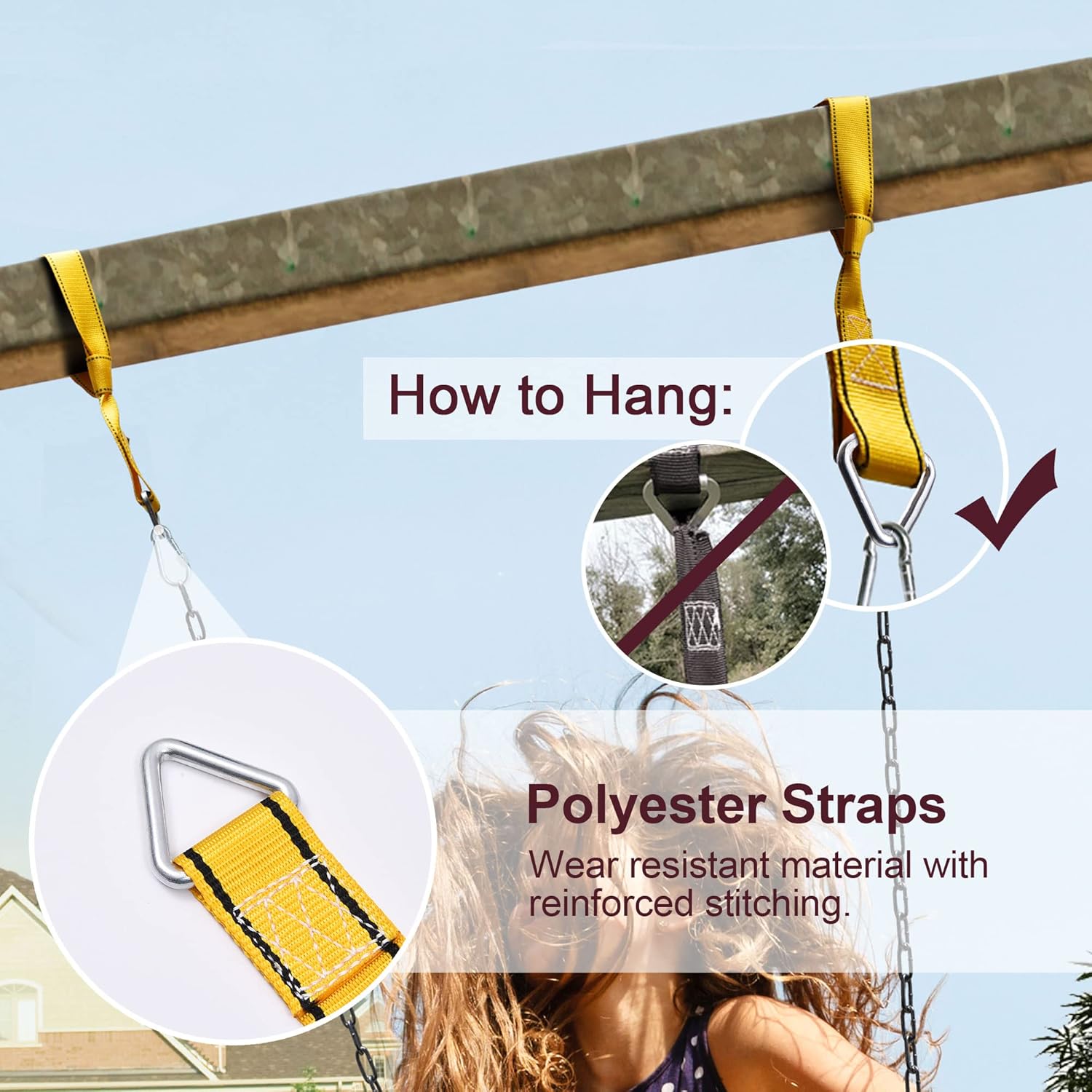 - ăNo Need to Buy Tree Swing Hanging StrapsăUnlike other swings for trees, extra two swing hanging straps (23.6" long each) are included in our sling swing seat so that you needn't to prepare other installation parts. It is easy to hang on the trees or other places without any tools and you can adjust the length to meet your needs by the hanging straps, which solves your concerns about the lack of length. What's most, polyester material of hanging straps has good performance of bearing force.