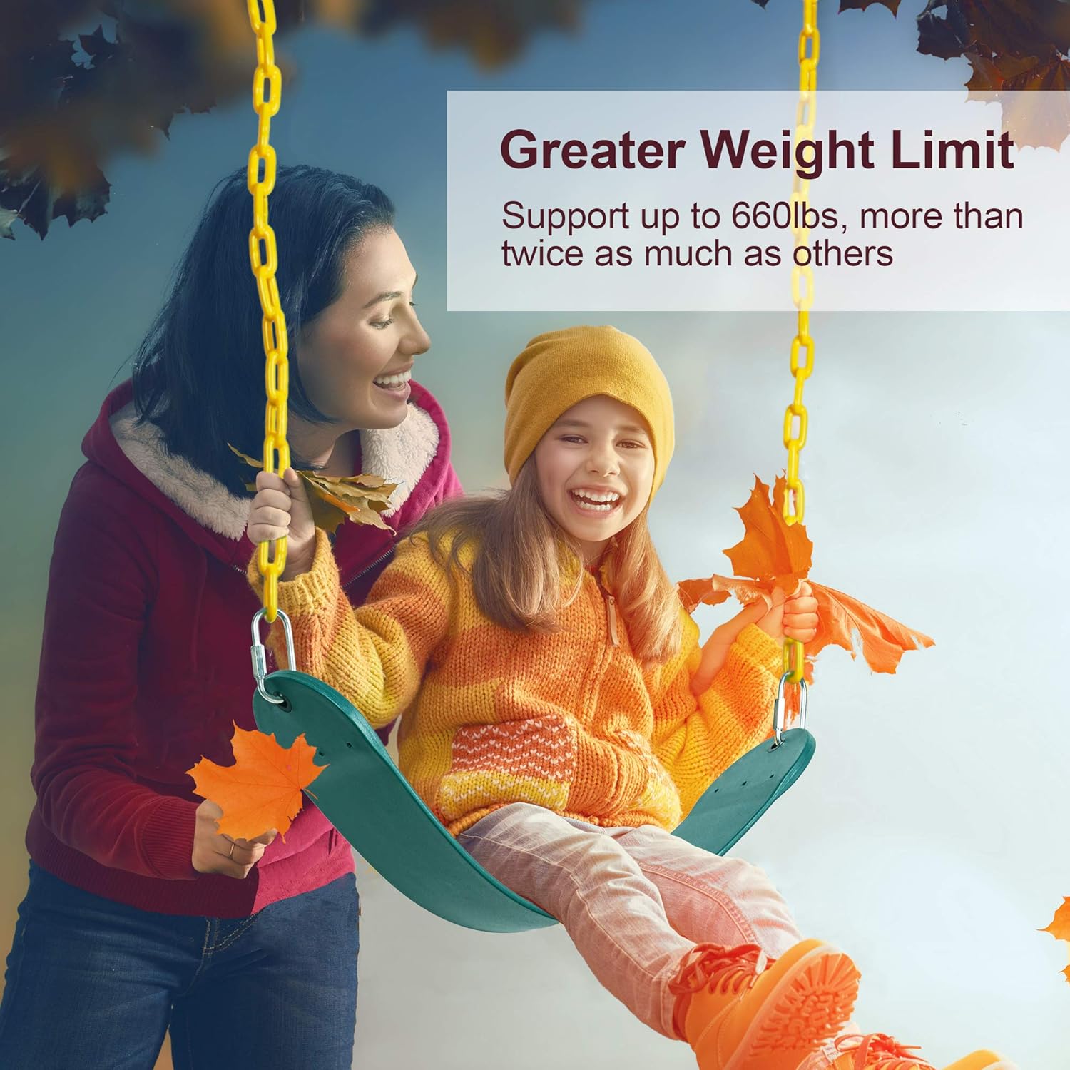 - ăComfortable Anti-rust ChainsăTwo zinc-plated chains of swings for outside (68.9" long each) are covered with thermoplastic to prevent corrosion and rusting. The plastic coated chains perfectly avoid the harm they might cause and the environmental protection material is comfortable to touch. Besides, the swing seat and chain has passed the pull test and ASTM standard, both of which are strong enough and safety guaranteed.