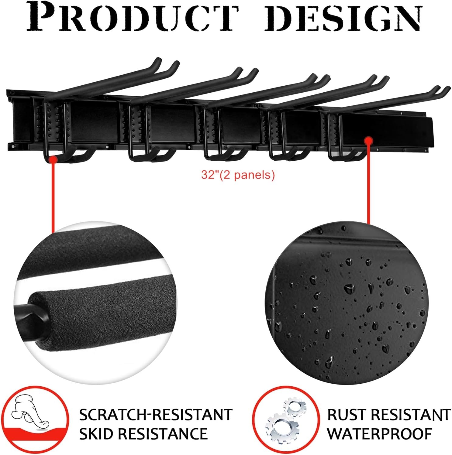 - Adjustable Rubber-coated Hooks: The hooks of the garden tool organizer for garage are rubber-coated (will not scratch the tool handles) and removable, you can customize the spacing between the attachments on the 32" steel rail (2 panels) to meet your needs. Its ease of adjustability makes it quite dynamic if your tool storage needs a change