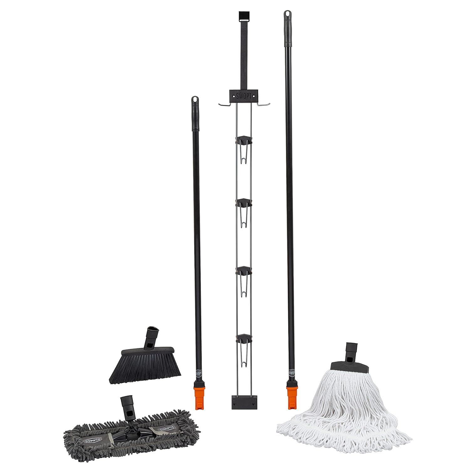 SWOPT Indoor Kit — Includes 18” Dust Mop, Cotton Mop, Angle Broom, 48” and 60” Steel Handles, and Organizer — Cleaning Heads with Long Handle Interchangeable with All SWOPT Cleaning Products
