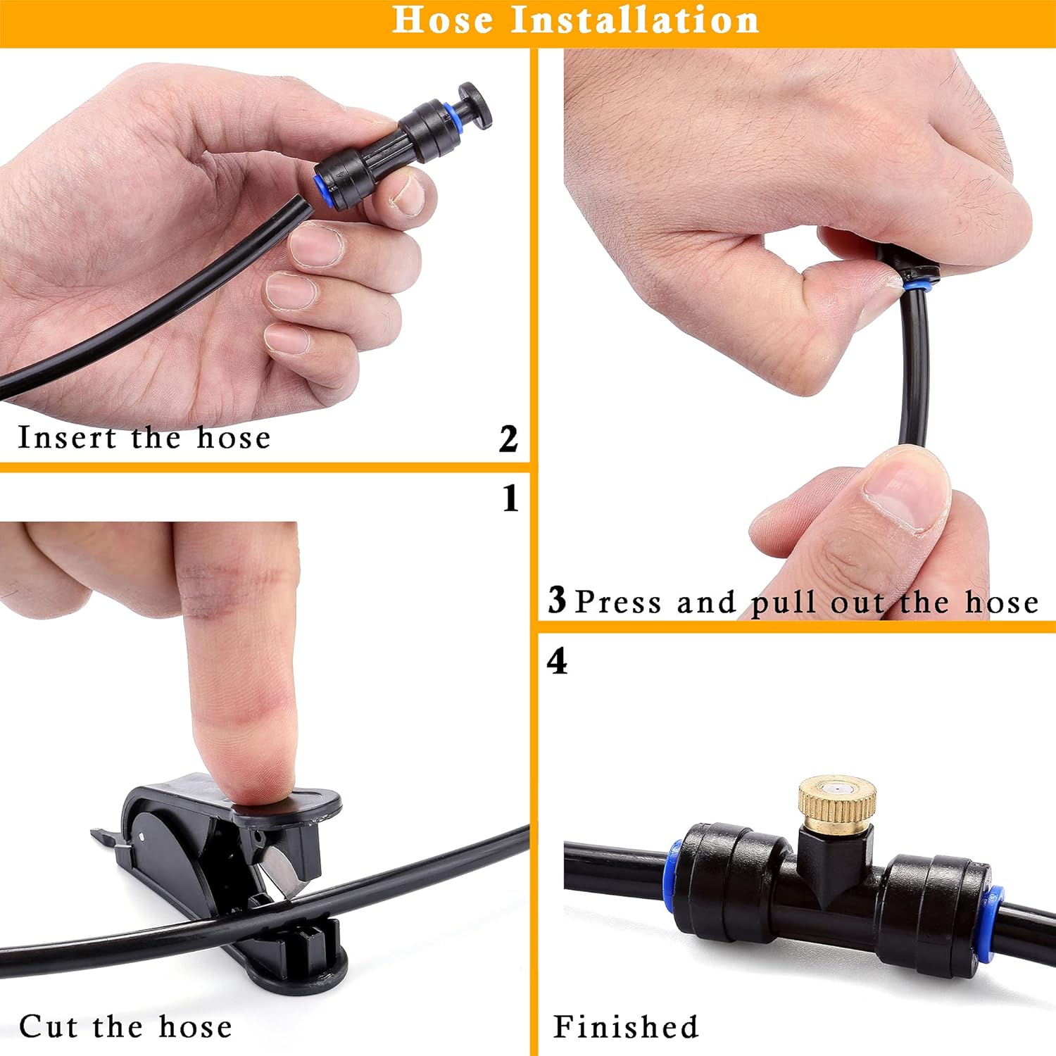 - 【Misting System Product List 】: 1 Instruction, 12V DC 60W 5L/Min self priming sprayer water pump+ power supply, 23.5M/77FT misting line with filter (including 3.5M/11.5FT spray hose+20M/65.6FT spray line), 26 brass misting nozzles, 26 T-tube connectors , 60pcs Cable Ties, 60pcs saddle clamps, 3/4inch(25mm) Standard water tap adapter, 1 PTFE Tape.