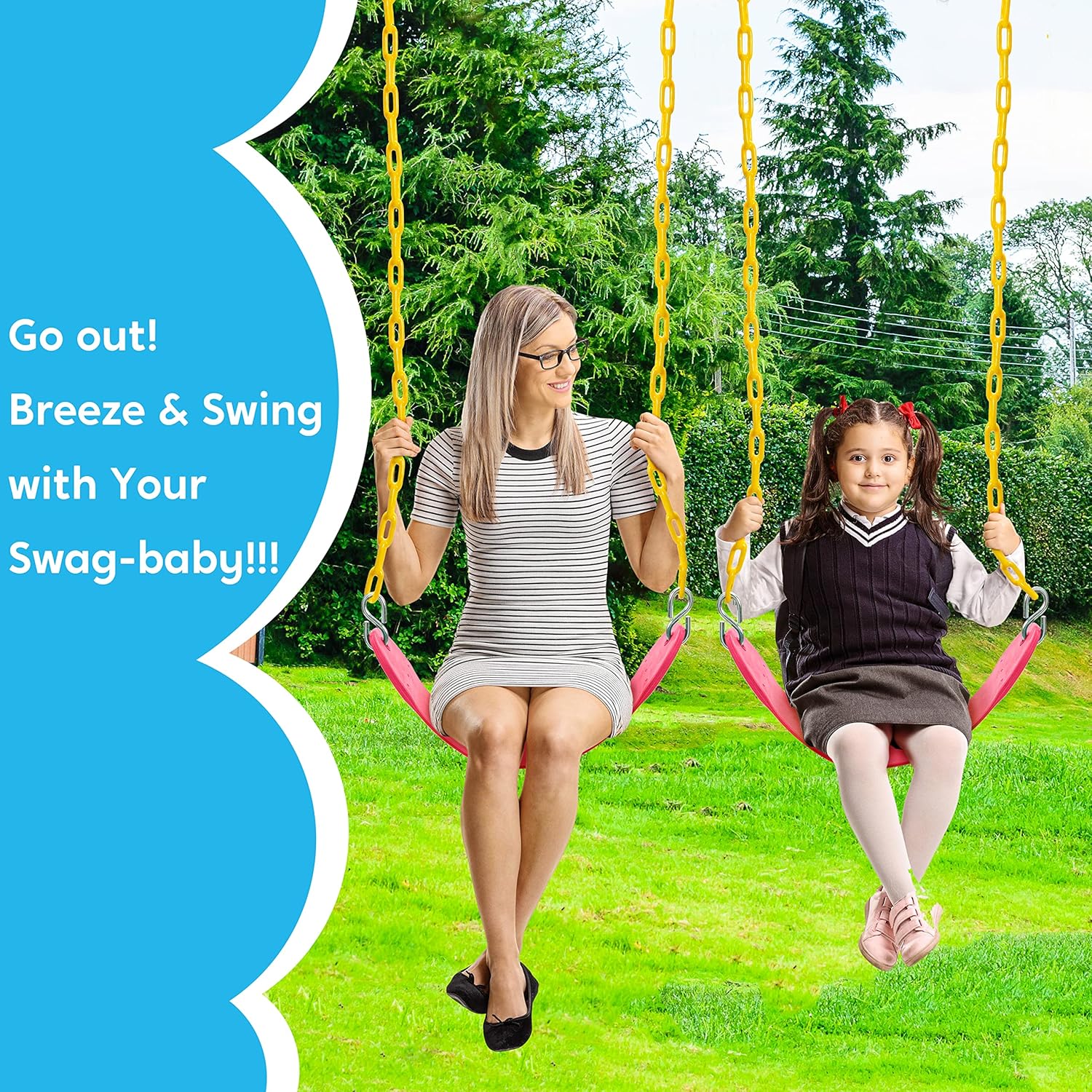 - SUPER VALUE.Our valuable kids swings set comes with 2 packs of heavy duty swing seats blooming with its radiant pink color. This outdoor play set for kids includes two flexible swing boards which are comfortable to sit on and allows parents and children to enjoy the childhood joy of swinging together! Our kids swing also includes a partially coated chain that is very comfortable to hold and four pieces of exquisite snap hooks.