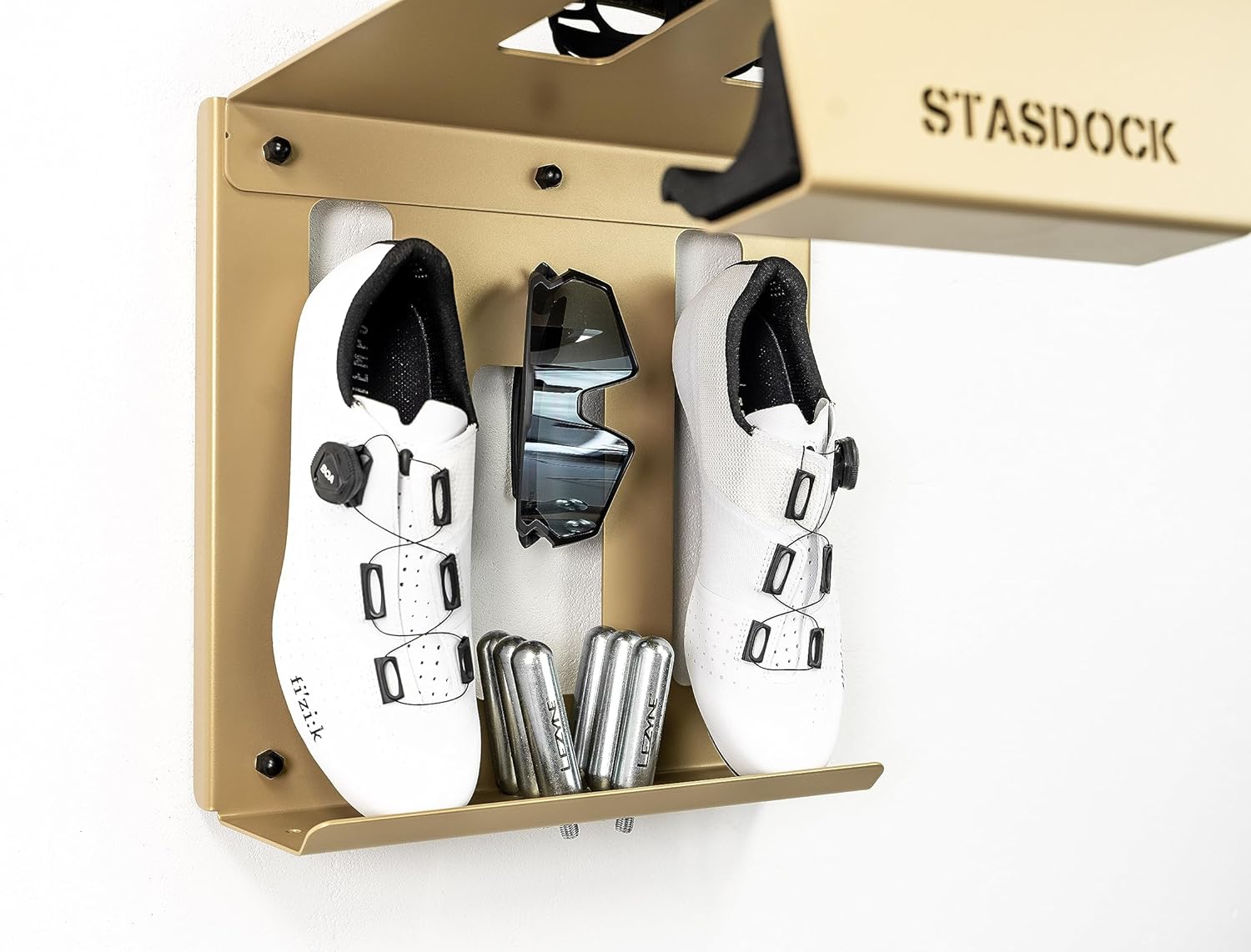 - β DESIGNFUL: Maximize your home or garage space with the Stasdock wall bike rack - designed to securely store your racing bike and its accessories such as shoes, helmet, glasses, and CO2 cartridges.