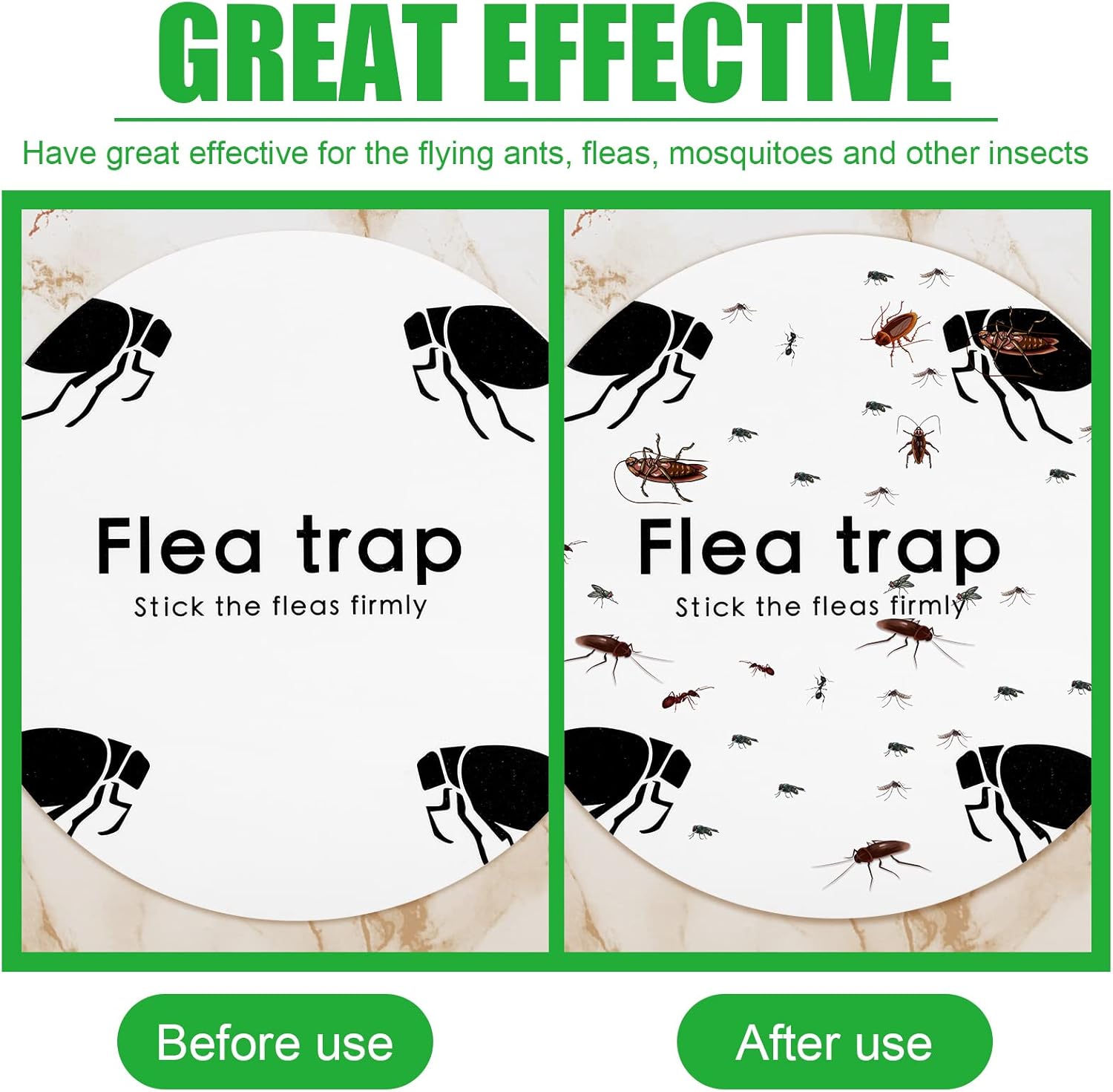 - Strong Stickiness: our flea sticky traps are highly adhesive, firmly affixing most small insects that land on them and effectively avoiding them from escaping, including moths, mosquitoes, fleas and more