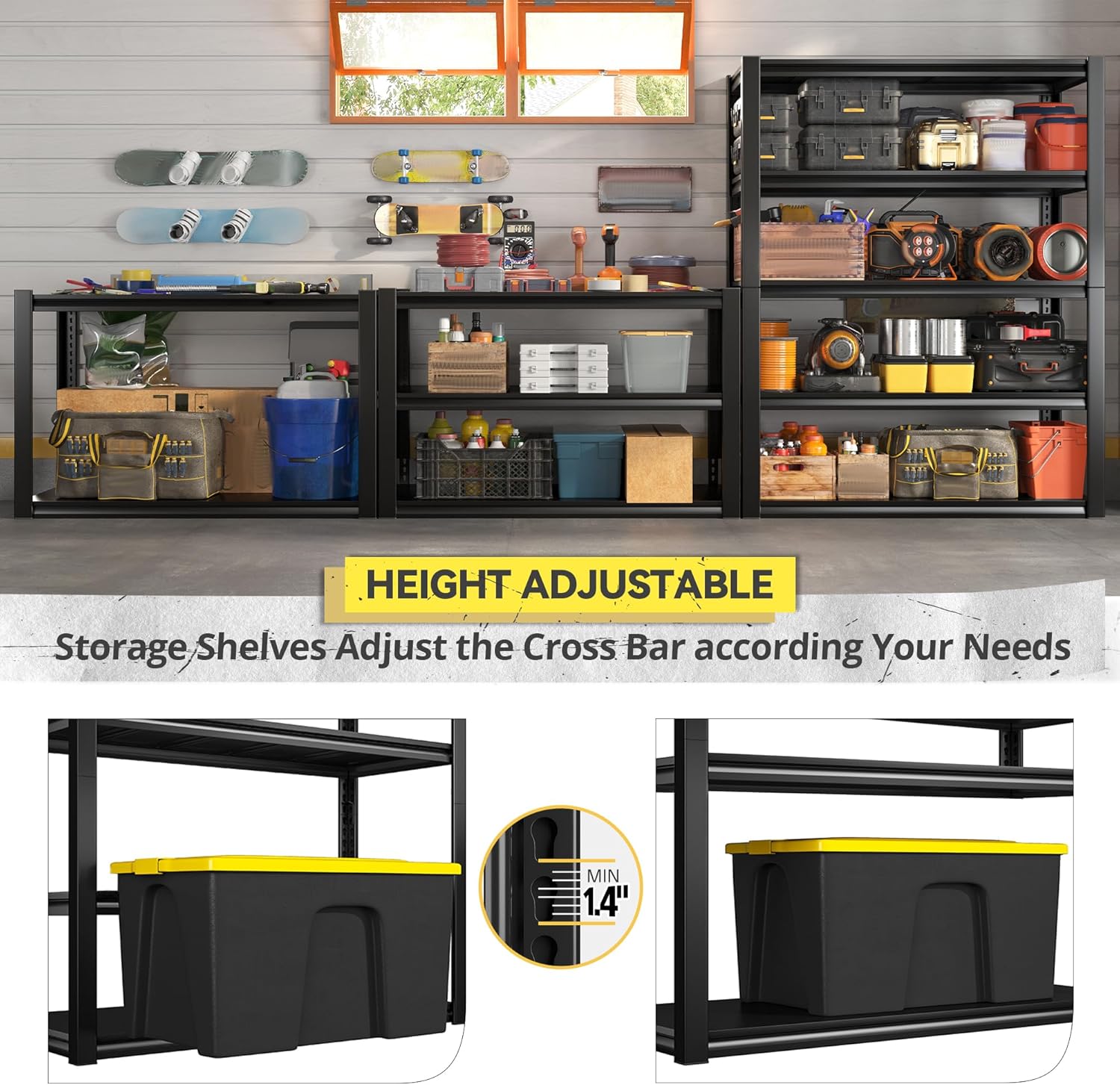 - Sturdy, Durable, Safe Garage Storage Shelves Lasts for Decades: No wobbling or shaking when fully loaded as two layer vertical bars will help distribute the pressure. Each metal board has 3 support ribs that ensures no dent or deformation. The garage shelving heavy duty lasts for decades (indoor dry condition) for all storage needs