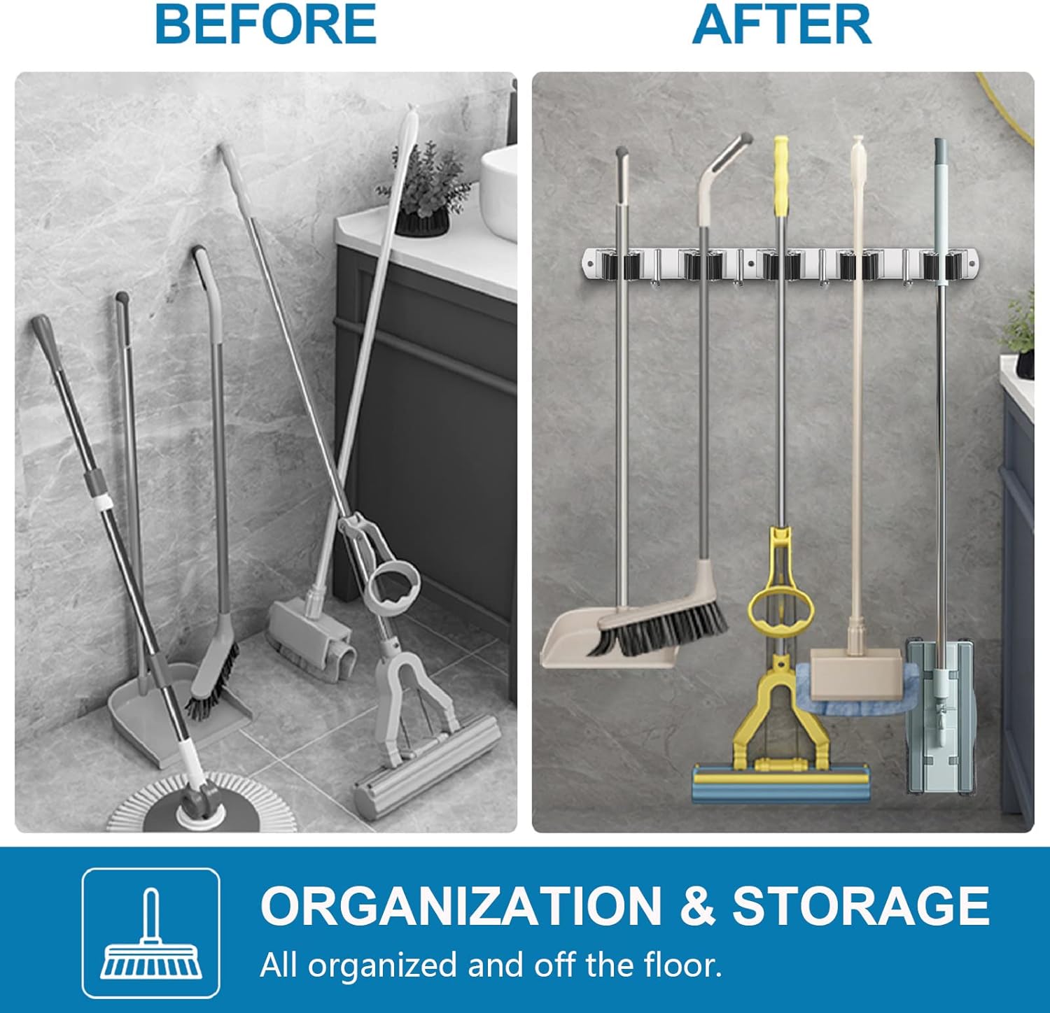 - VERSATILE DESIGN: You can easily organzier your home, such as laundry room, kitchen, closet, garage, pantry, basement. This garage organization also works garden or a shed. You can easy access your broom, mop, swifter, dust pan, small vacuum, rakes, shovels and more
