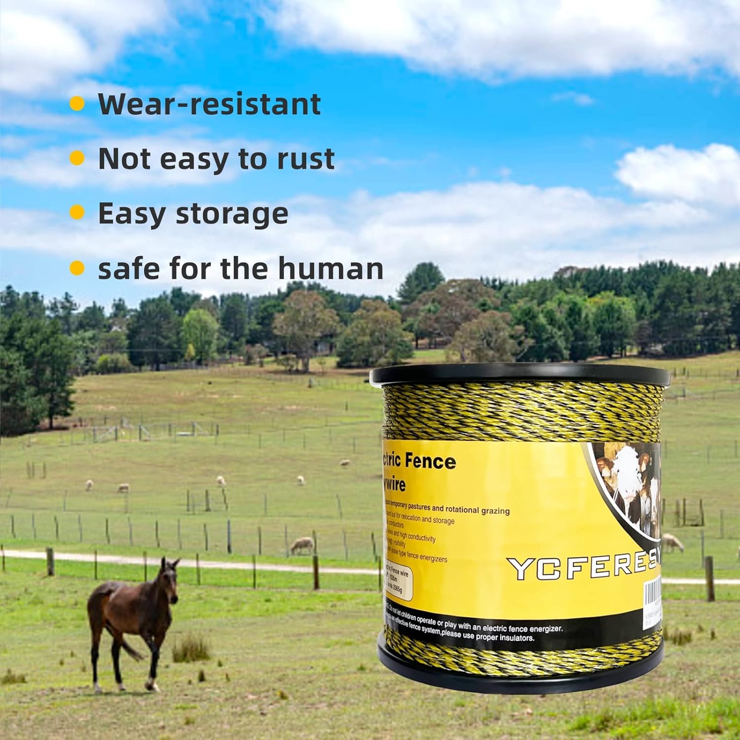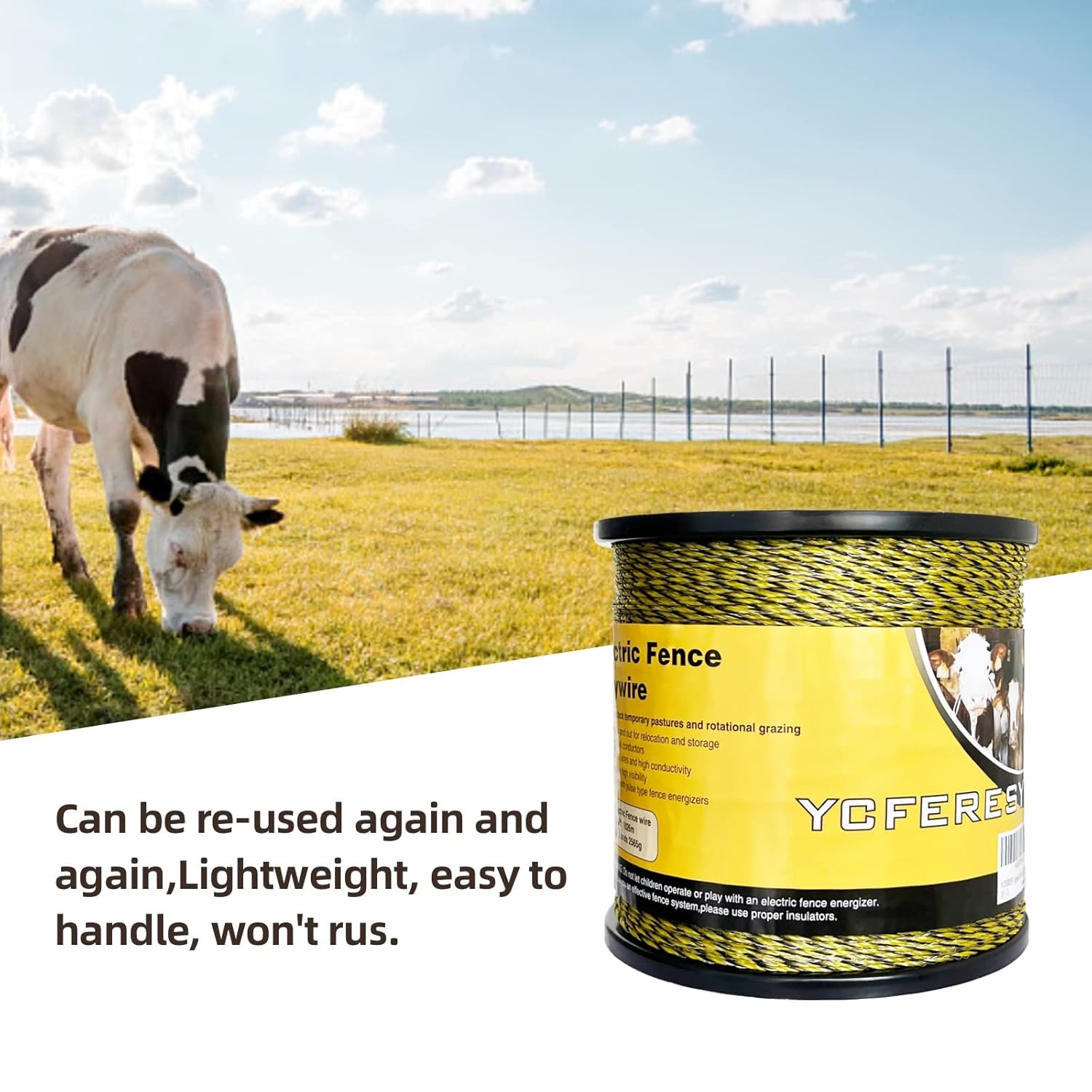 - 🚧【Easy to use and Rust Resistant】Easy to install, repair, splice, and rewind; can be re-used again and again,UV Stabilized polymer webbing for long life,Lightweight, easy to handle, won't rush. That it will last out on the farm through continuous years using.This Electric Fence Poly Wire is made of premium stainless steel with resists rust and UV resistant, it delivers more reliable performance than aluminum wire which will develop an oxide coating over time, reducing its effectiveness and conductivity.
