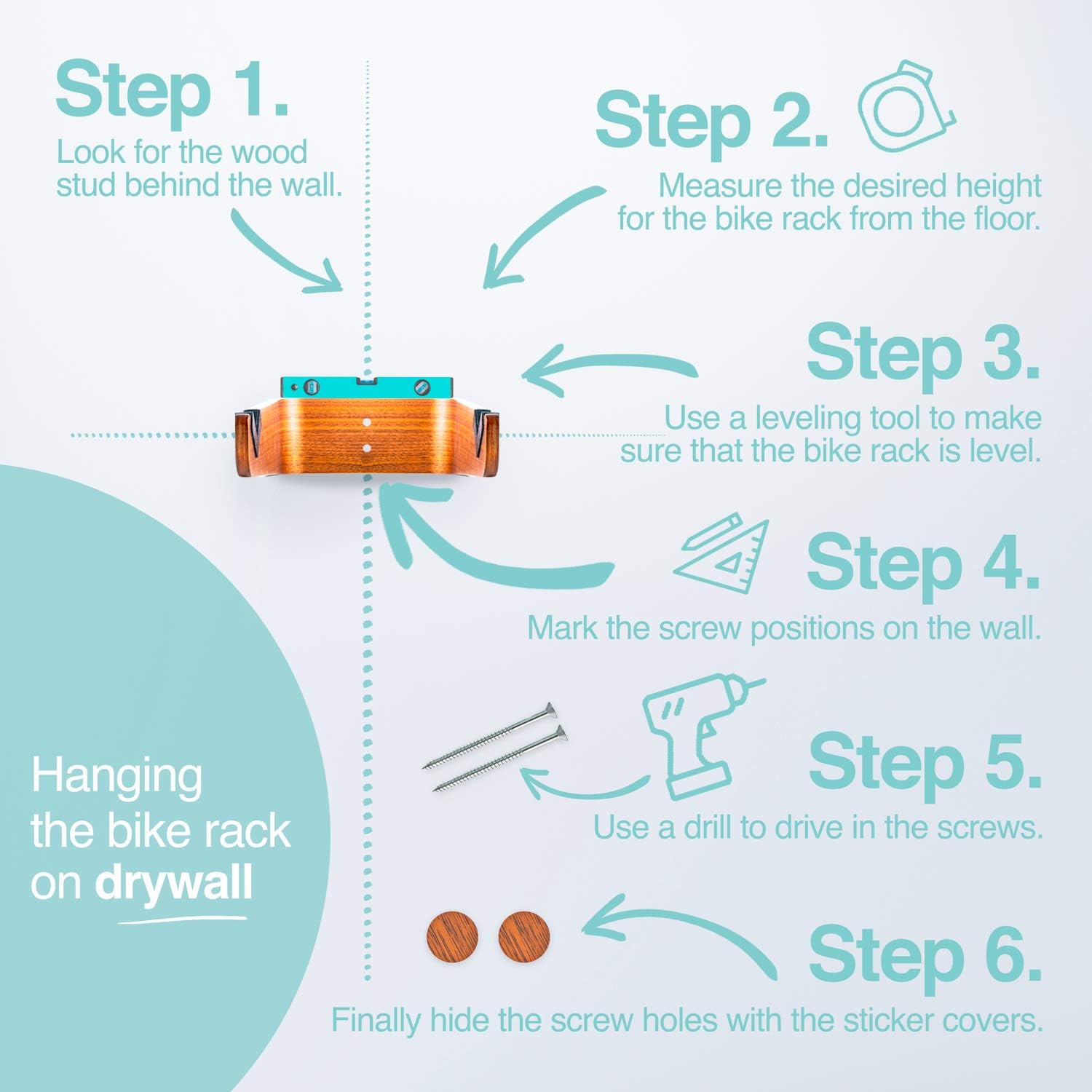 - EASY TO ASSEMBLE: The Wokk bike wall mount comes with two 6mmx100mm countersink screws for drywall (studs only - you can't hang it up everywhere on a drywall, you need to find the studs!) , two 8mmx110mm plugs for concrete walls, and two stickers to hide the screwheads. You can create your decorative bike storage solution in just minutes and make it even easier to pedal your Trek, BMX or whichever bicycle type you prefer around town.