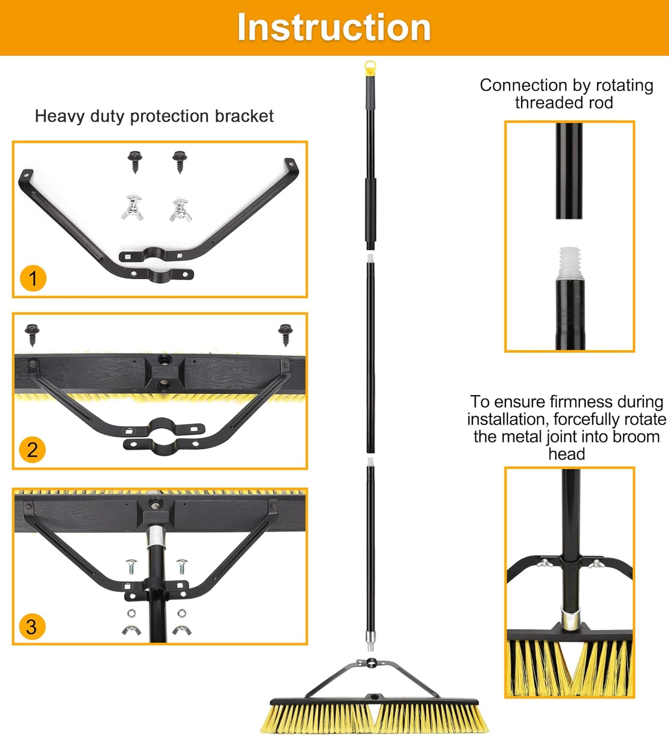 - Extra Long Handle Outdoor Broom- Garden broom outdoor with 63" long handle comes in four sections , 45ยฐangle, ergonomic design, reduce the pain in the knees and back while do housework,stiff broom head and the handle are in threaded connection, which is not easy to loosen.