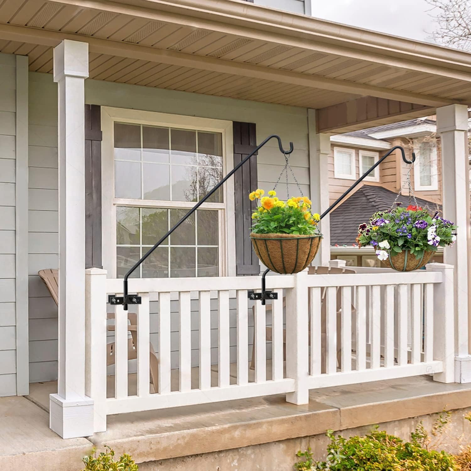 - High Quality Railing Hooks: The shepherd hooks for decks are made of heavy duty steel. The surface is coated with a black powder coating, which can be used outdoors for a long time even in bad weather and is not easy to rust. The sturdy brackets and curved rod tips help securely hold items in place.
