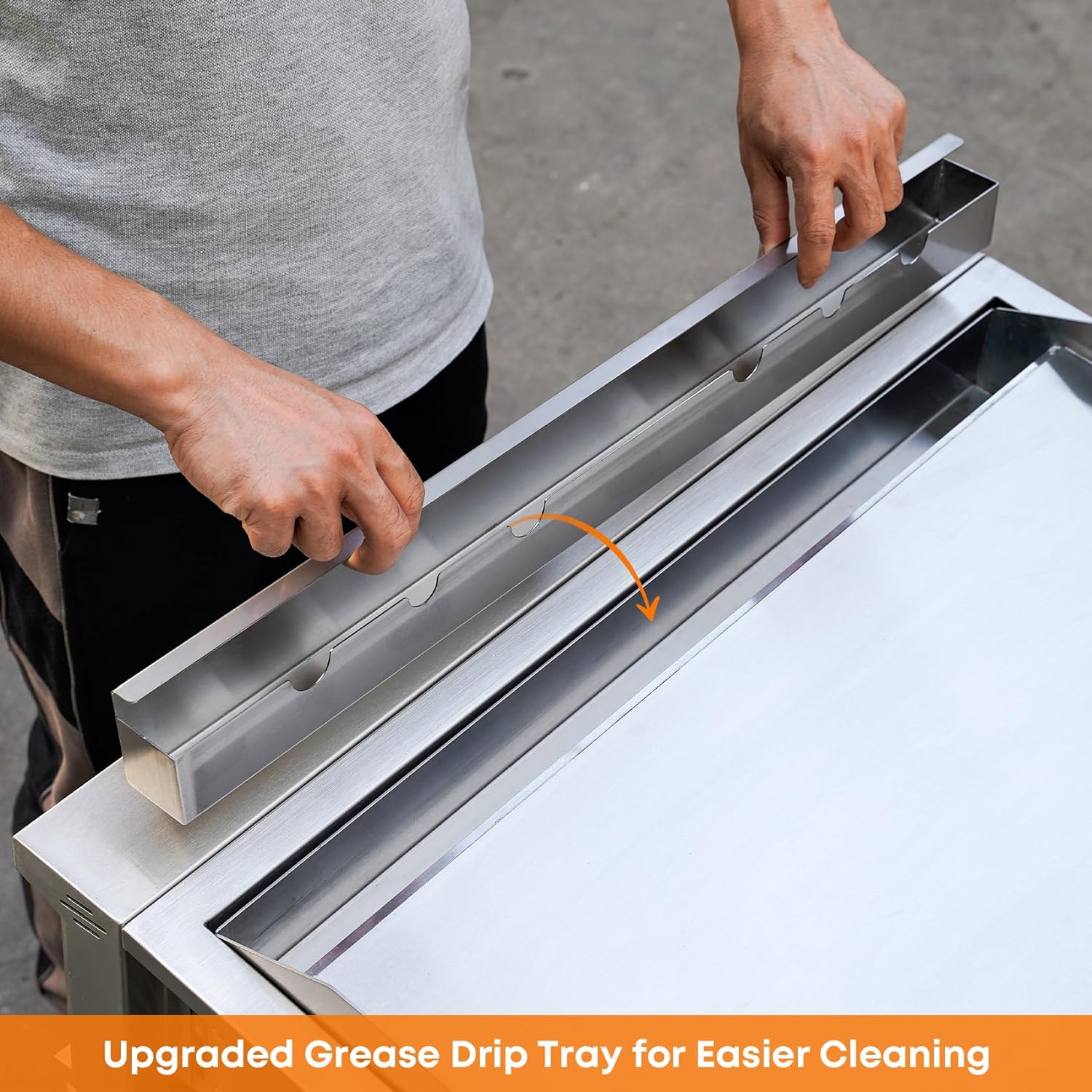 - ăEasy to Cleană The stainless steel components and upgraded drip tray also make the griddle easy to clean and maintain.