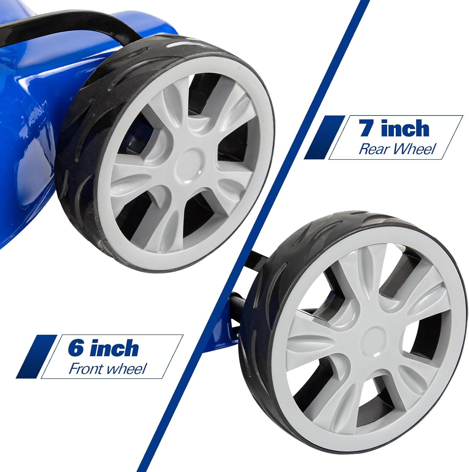 - Mowing Convenience - 7" rear/6β front double ball-bearing wheels achieve smooth movement, comfortable foam-wrapped angled grip eliminates grasp fatigue.