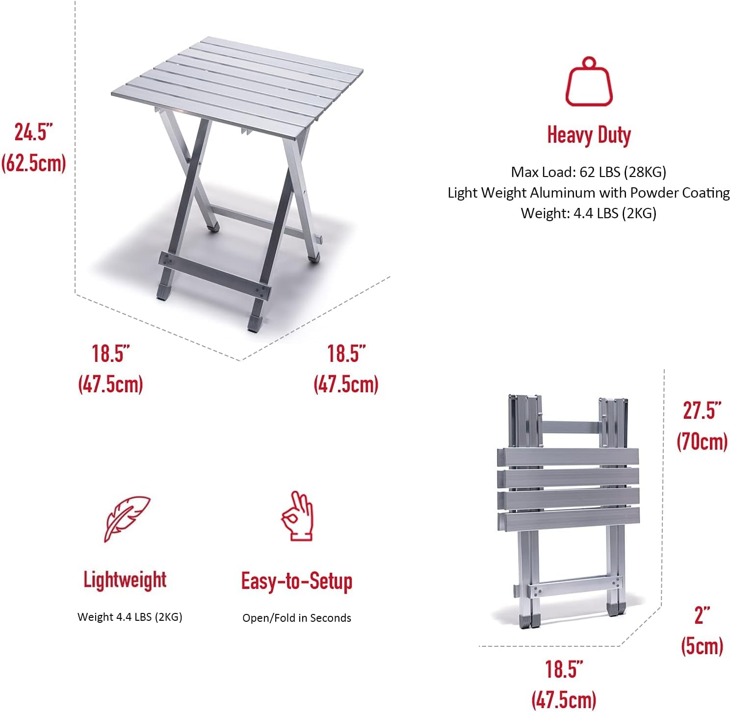 - Built to Last: The lightweight aluminum with powder coating has great strength, durability, This outdoor compact folding side table affords up to 62 LBS (28KG) weight capacity, and it is 100% waterproof for effortless clean-up.