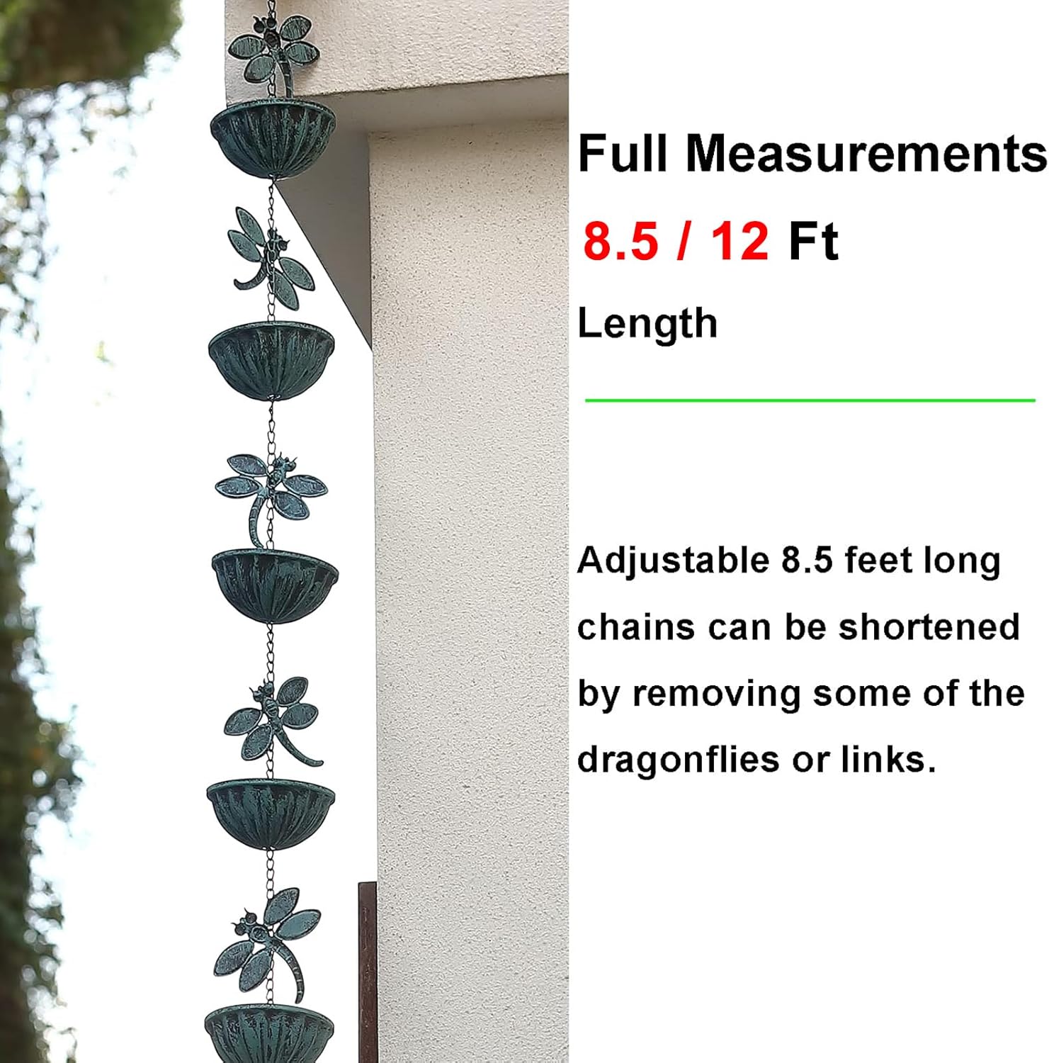 Iron Dragonfly & Cups Rain Chains, 12 Ft Replacement Downspout for Gutters, Antique Blue