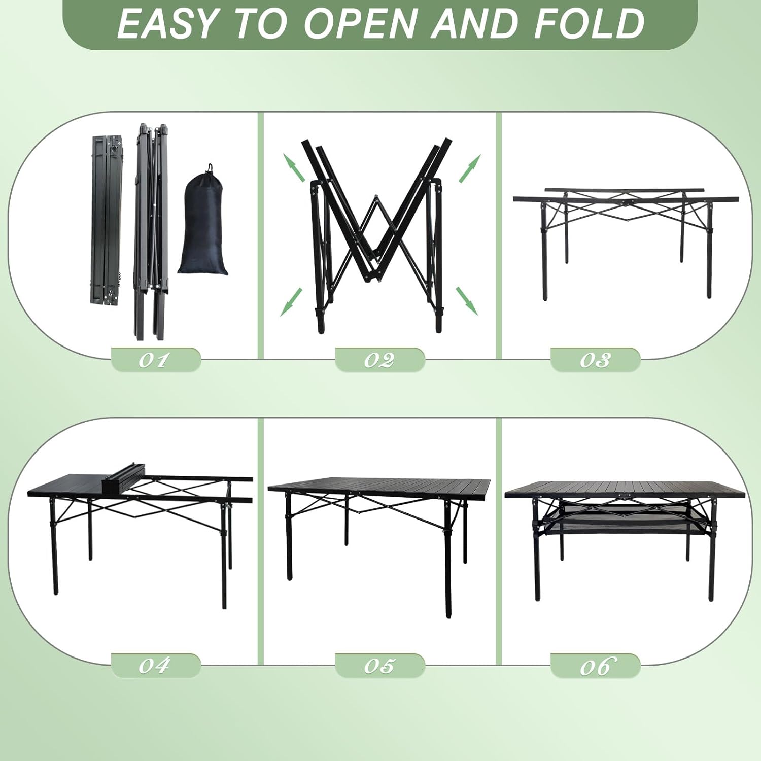 Large Folding Camping Table Aluminum with Storage for 4-6 People 55"X27.5" Roll Up Tall Outdoor Portable Table Lightweight with Carry Bag for Picnic BBQ Backyard Beach