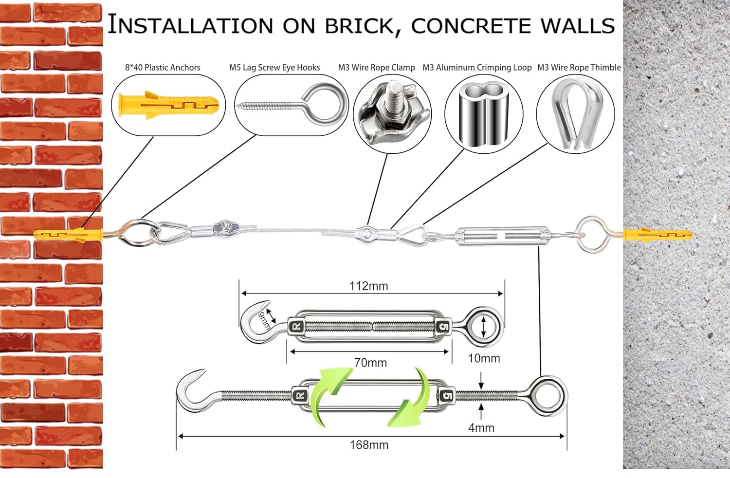 - 【1/8" Stainless Steel Wire Rope】 :application suitable for shade sail hardware, curtain wire hanging system,globe lights hanging, patio lights hanging garden , hang pictures ,outdoor applications of tent rope, clotheslines, hanging outdoor lights, deck cable railing and etc.