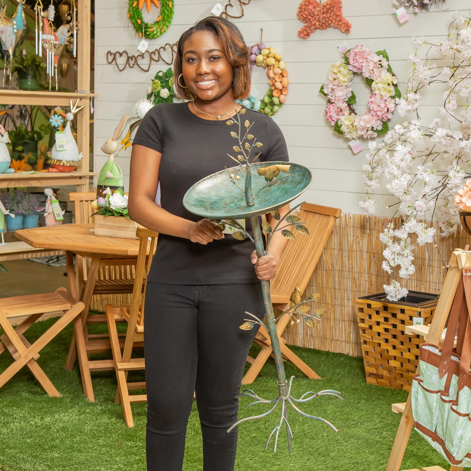 Evergreen Cast Metal Outdoor Garden Bird Bath and Feeder on Pedestal | Birds on Leafy Branch | 37.5 inches Tall | Antique Finish | Round Bowl Outside Rustic Decor Patio Porch Deck