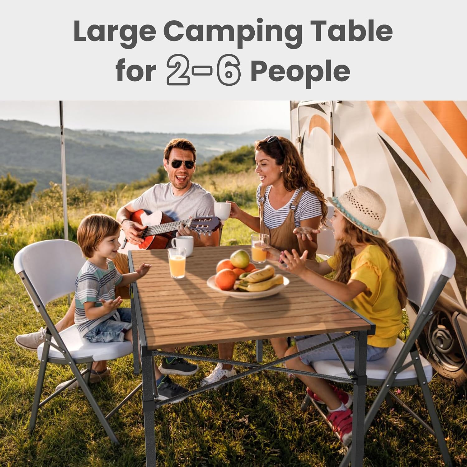 - Large Size: The foldable camping table features a spacious 46.4 ร 27.5-inch tabletop, providing ample room for a small party of 4-6 people or a family gathering. With a 27.6-inch height, it comfortably accommodates chairs, allowing you to stretch your legs freely without hitting any obstructive bars underneath.