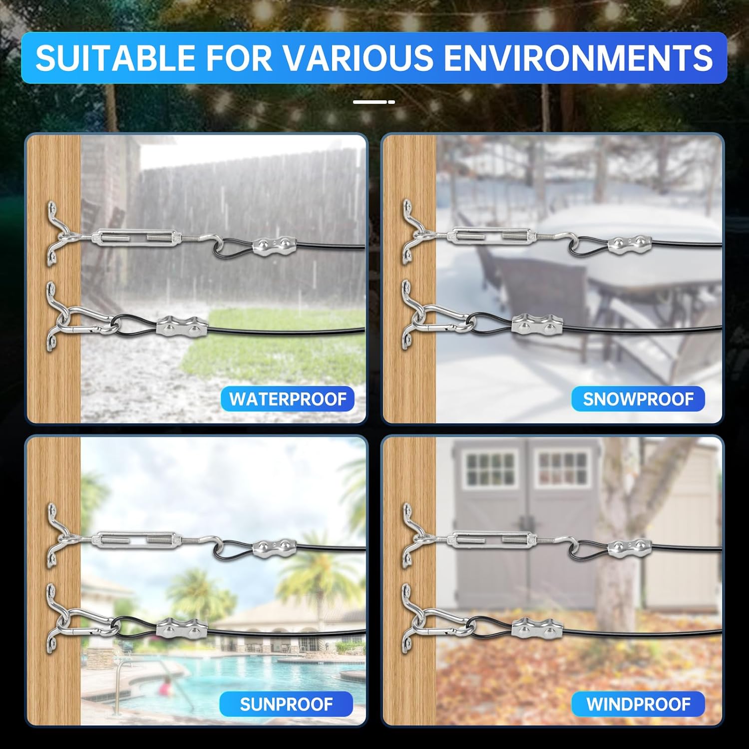 - 【Easy to Install 】:Guide Wire for Outdoor String Lights Each Part is Threaded, and Our Wire Rope Kit Includes Simple Tools to Assist in the Installation, to Better Secure All the Accessories, Easy to Assemble or Disassemble, Reusable. The Double Rope Clips Inside Our Steel Cable Kit Hold the Wire Rope more Securely than Single Rope Clips, and The M5 Turnbuckle are Adjustable in Length, Allowing You to Easily Install the String Lights on Wood, Timber or Concrete Walls.