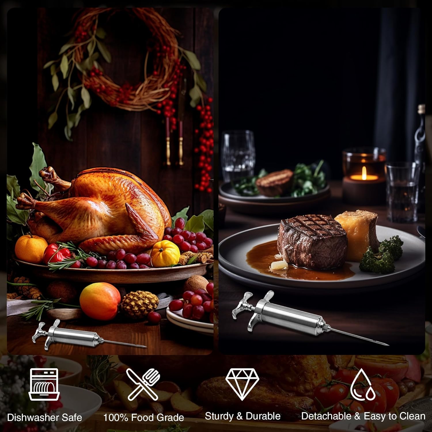 - Flavor Injector for Turkey&Meat: The meat injector syringe is used to suck the delicious marinades and inject marinades for chicken, turkey, and other meats. You can use this cooking syringe to remove excess oil, ensuring that your dish tastes rich and even.