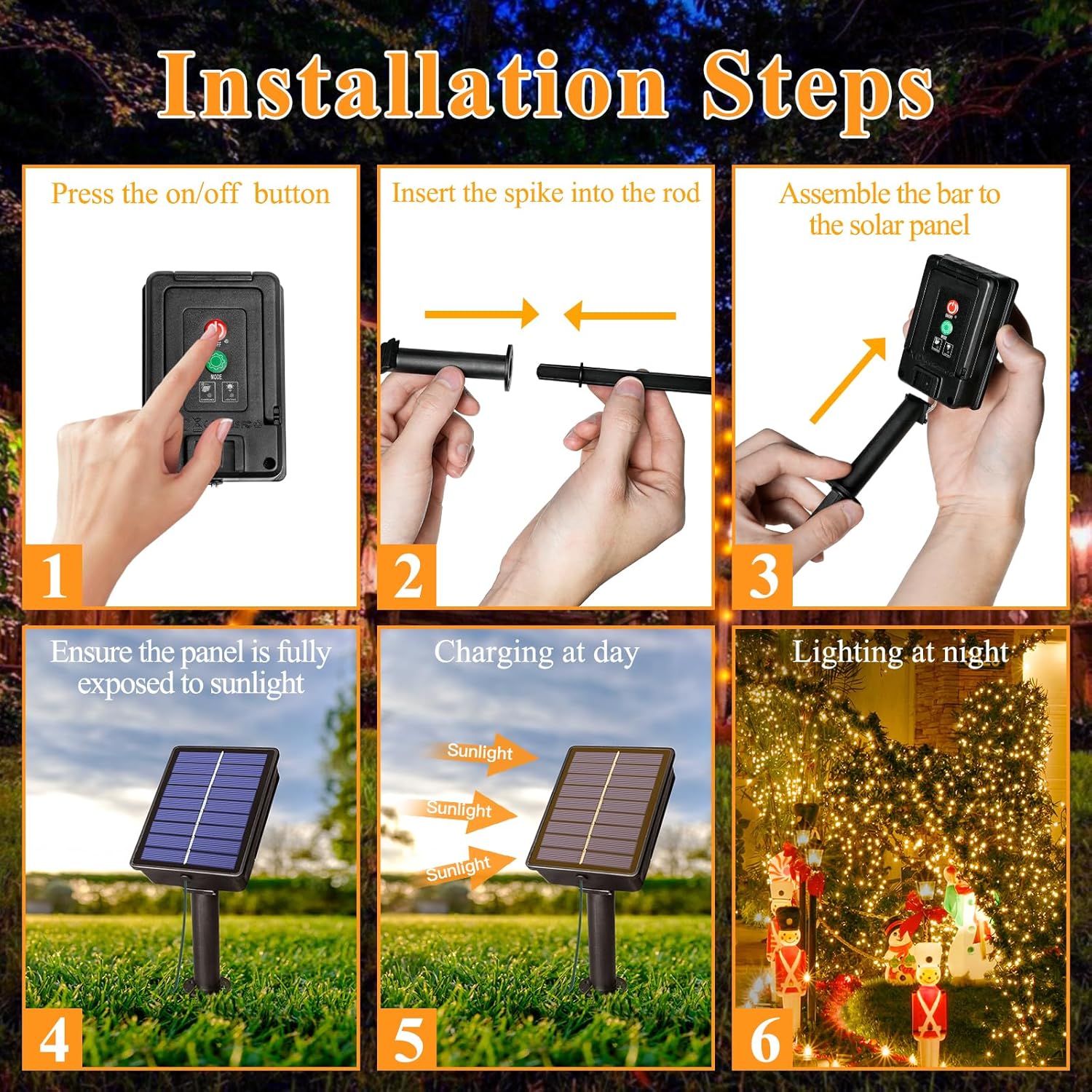 - Using Steps: First test the solar light before installation. When the ON/OFF button is pressed, the power indicator light becomes red. Place the solar panel on the ground upside down, then fully cover it. The solar light should turn on. Sencondly, if lights do not turn on, place it in direct sunlight for an hour. Recheck. Note: avoid overstretching cables while separating or extending lights, and avoid using excessive force when installing