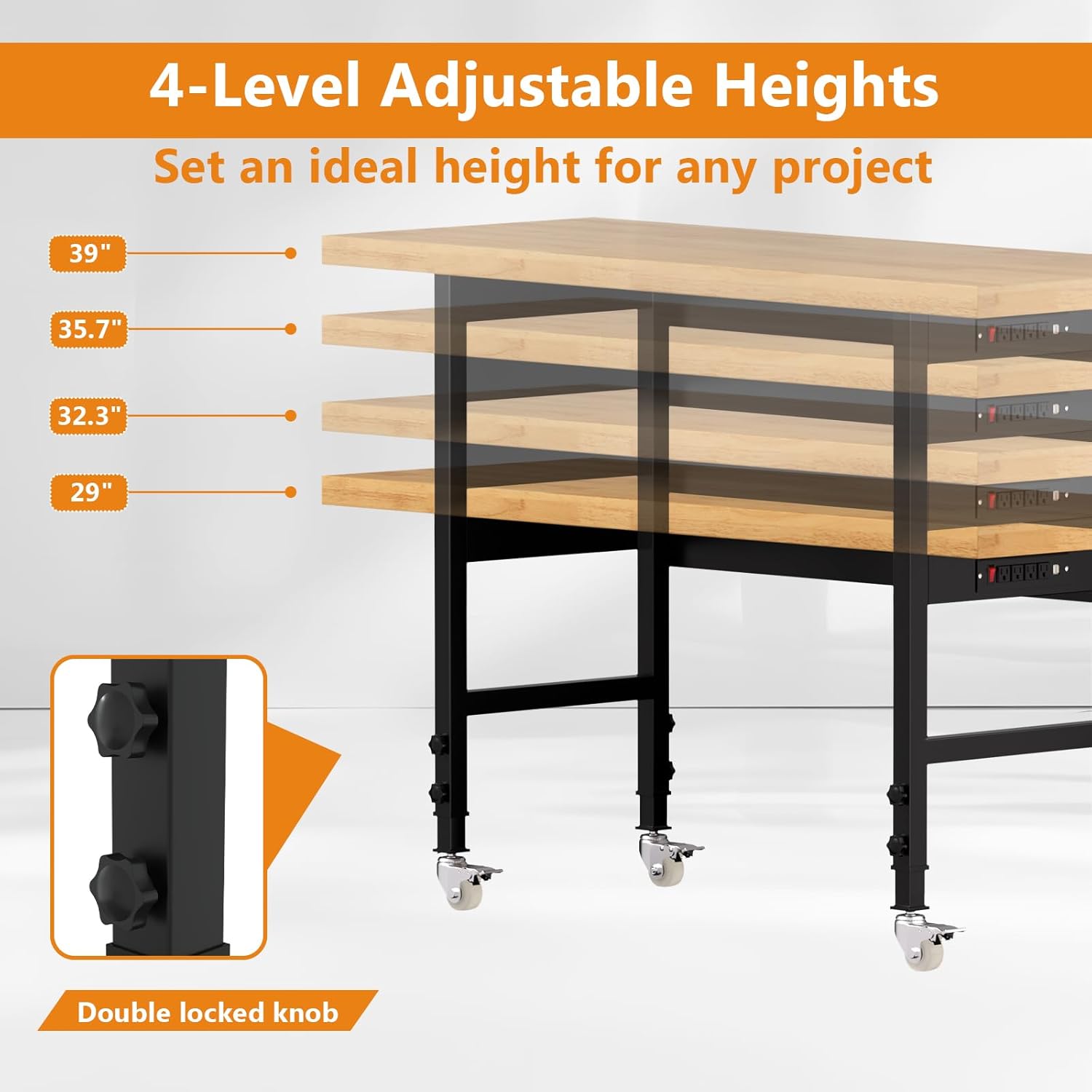 - ADJUSTABLE HEIGHT WORKBENCH: Each leg of the workbench is equipped with 2 locking knobs, by adjusting the locking knobs you can make the height of the workbench freely adjustable between 29 inches and 39 inches. This feature allows you to work in different scenarios sitting or standing, making you more comfortable.