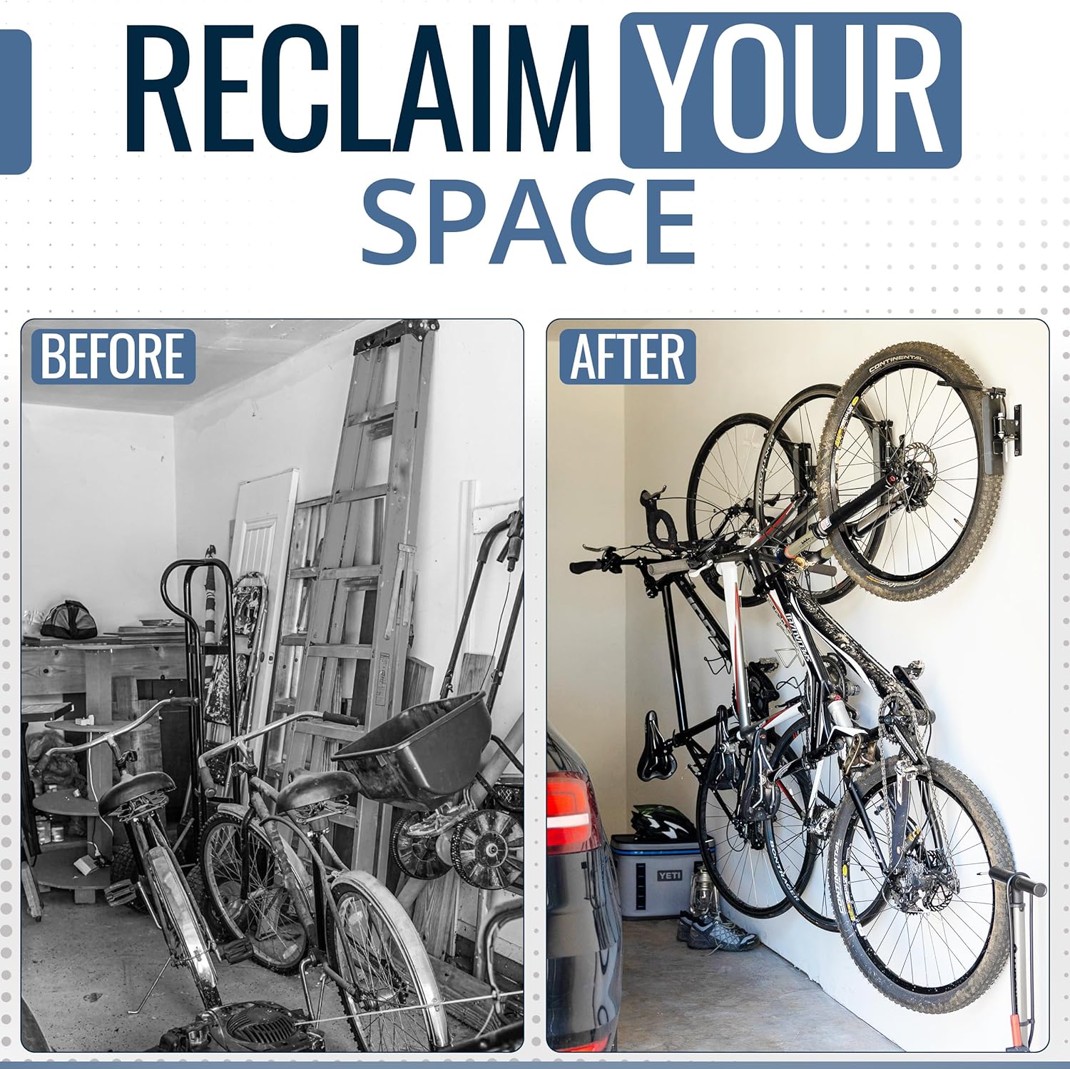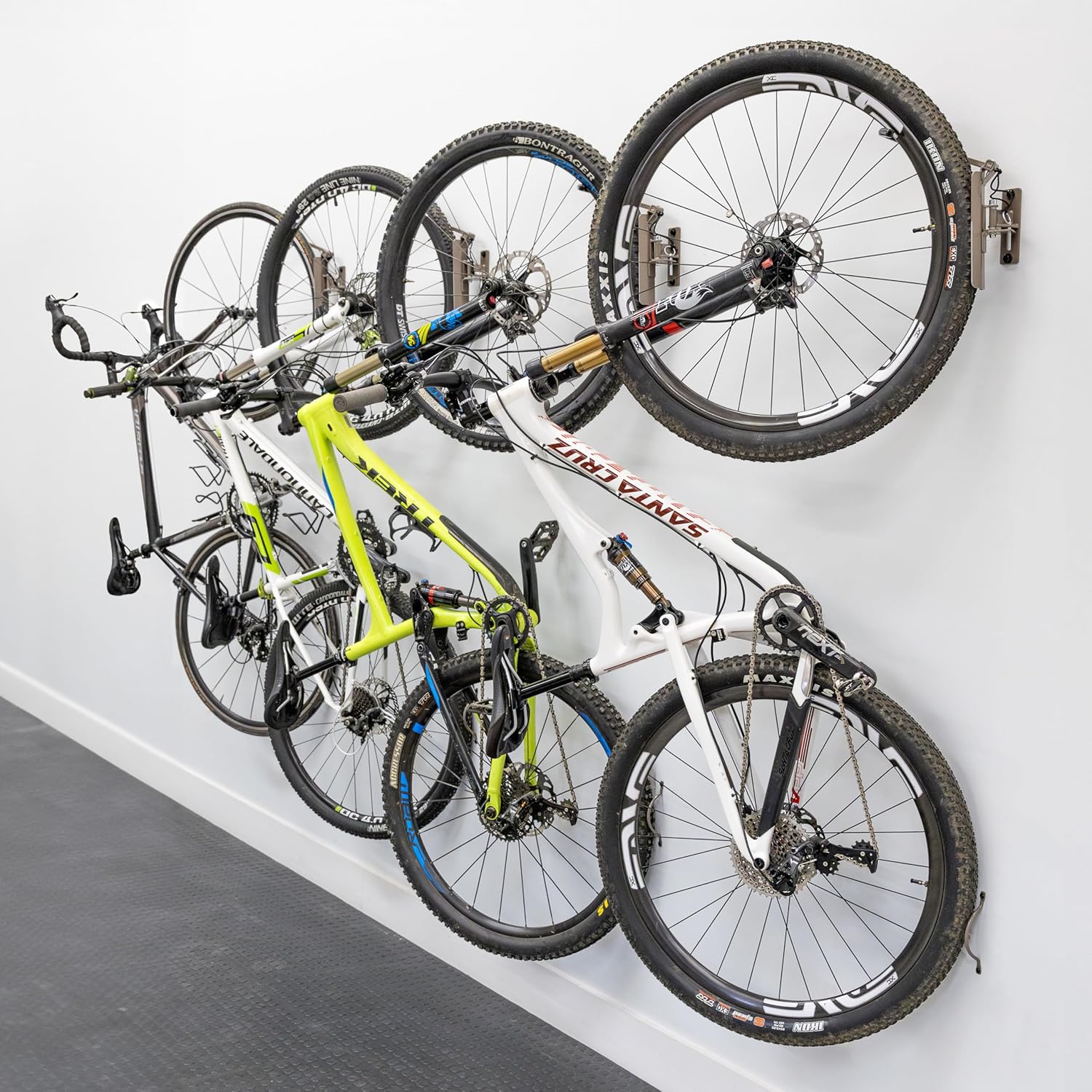 - WALL-MOUNTED BIKE STORAGE – Reclaim your garage, shed, or apartment space with this space-saving vertical bike rack. Designed to mount securely to wall studs, each rack stores one bicycle flat against the wall, making it ideal for indoor bike storage in tight spaces. Compatible with a variety of bikes including road bikes, e-bikes, folding bikes, and more. Fits tires up to 2.6" wide and up to 29" in diameter.