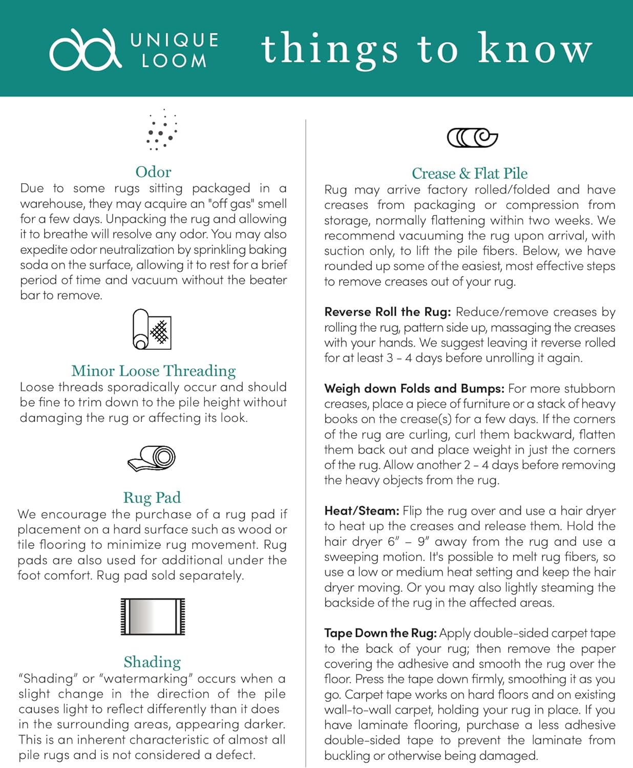 - SHIPPING: Rug will arrive factory rolled/folded and may have creases from packaging & compression from storage, normally flattening within 3-7 days. Reduce/remove creases by rolling the rug, pattern side up, & massaging the creases with your hands.