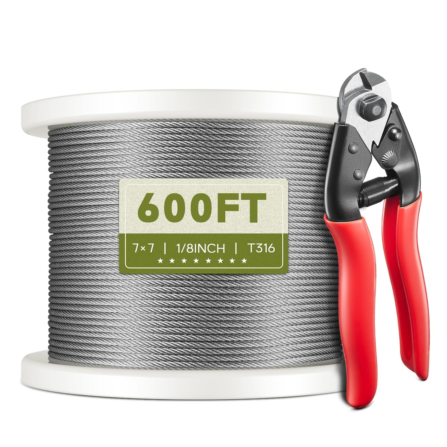 600FT 1/8" T316 Stainless Steel Cable, Wire Rope Aircraft Cable for Deck Cable Railing Kit and DIY Balustrades, 7x7 Strands Construction, Comes with a Cutter