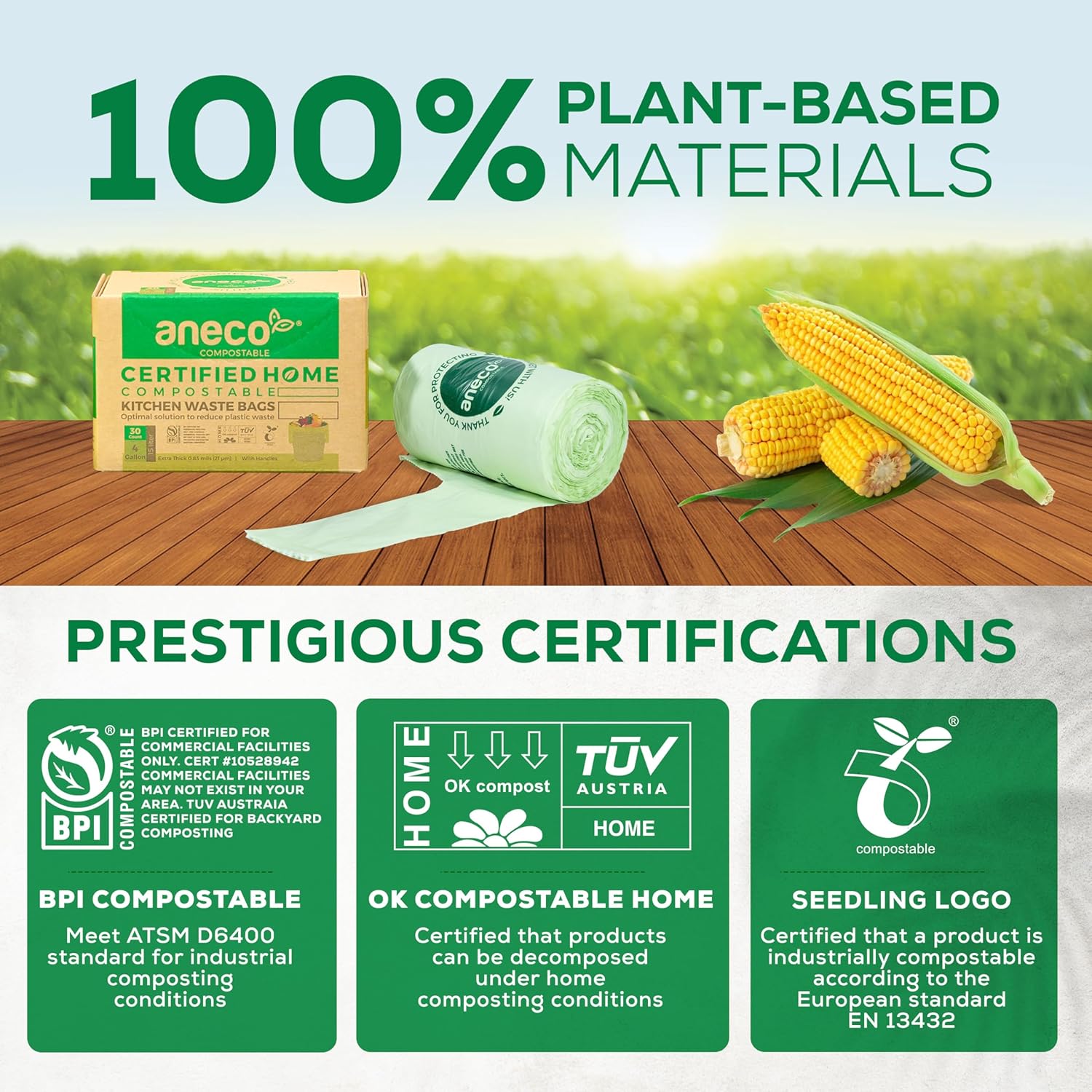 - ๐ ๐๐ฎ๐ฌ๐ญ๐๐ข๐ง๐๐๐ฅ๐ & ๐๐๐ญ๐ฎ๐ซ๐๐ฅ๐ฅ๐ฒ: Made from renewable resources like corn starch and plant-based materials, ANECO compost bags for countertop bin decompose naturally into CO2, water, and biomass within a year, leaving no harmful traces. Prestigious certifications from BPI Compostable (US standard ASTM D6400), TUV Austria (OK Compost Home), and European Bioplastics (Seedling Logo) guarantee their eco-friendliness.