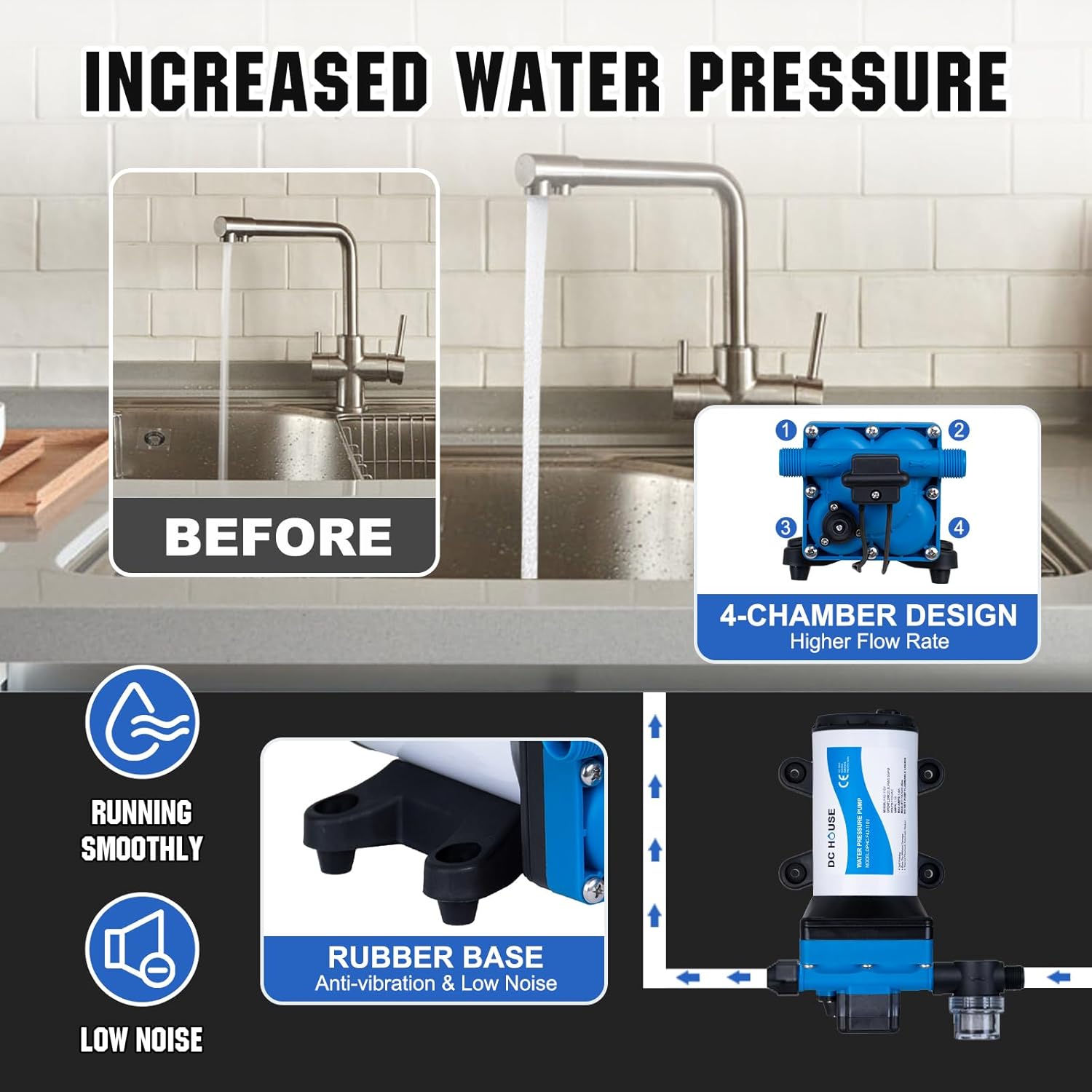- Built in automatic pressure switch which turns it on immediately when the faucet on. It's super quiet, thermally protected, and can run dry without damage.