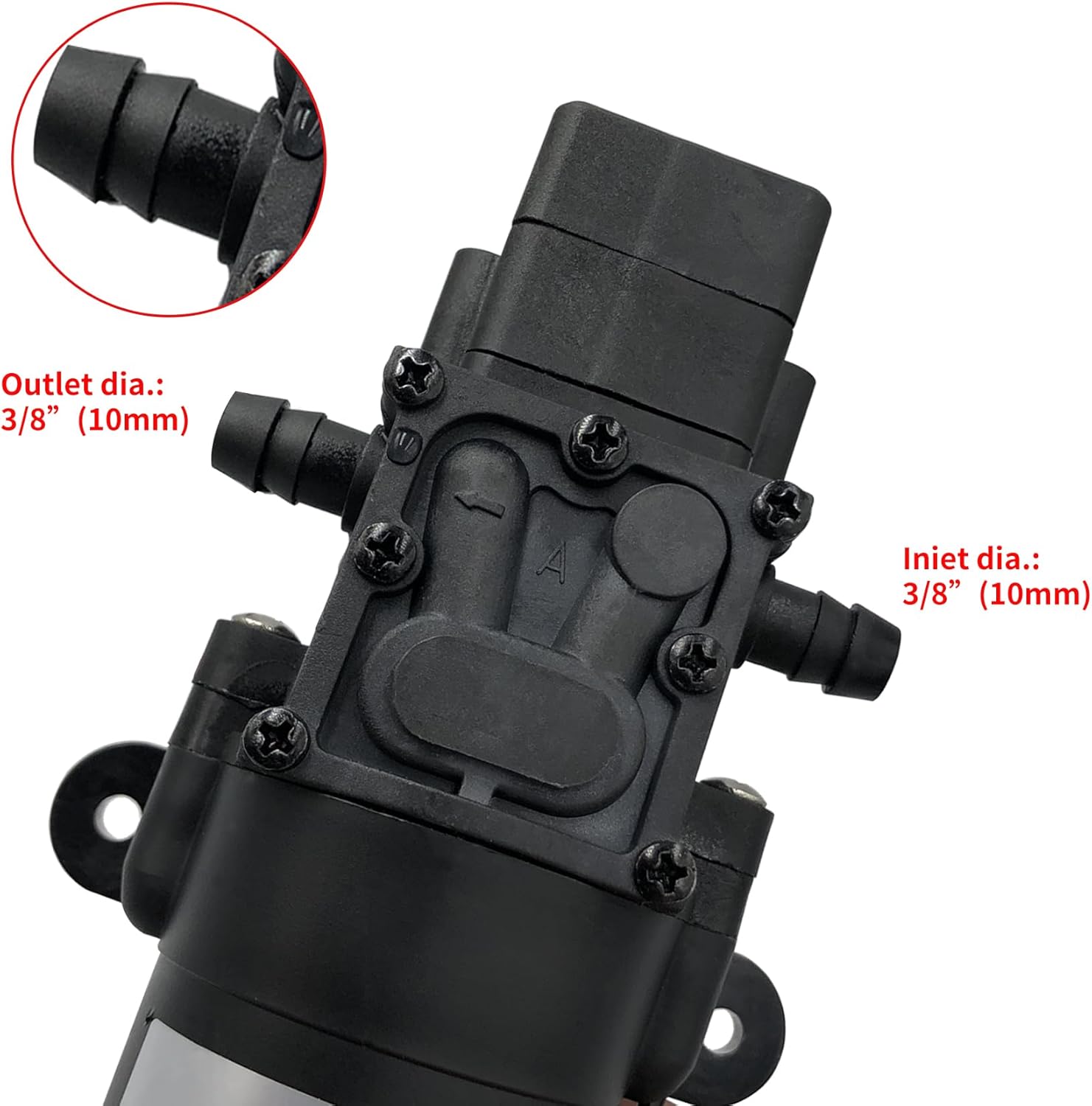 DC 12V Diaphragm Pump, Self-Priming Sprayer Pump, 1.2 GPM 87 PSI Pressure Switch Adjustable water pump, With 2 hose clamps, for RV Camping Shower Garden Irrigation