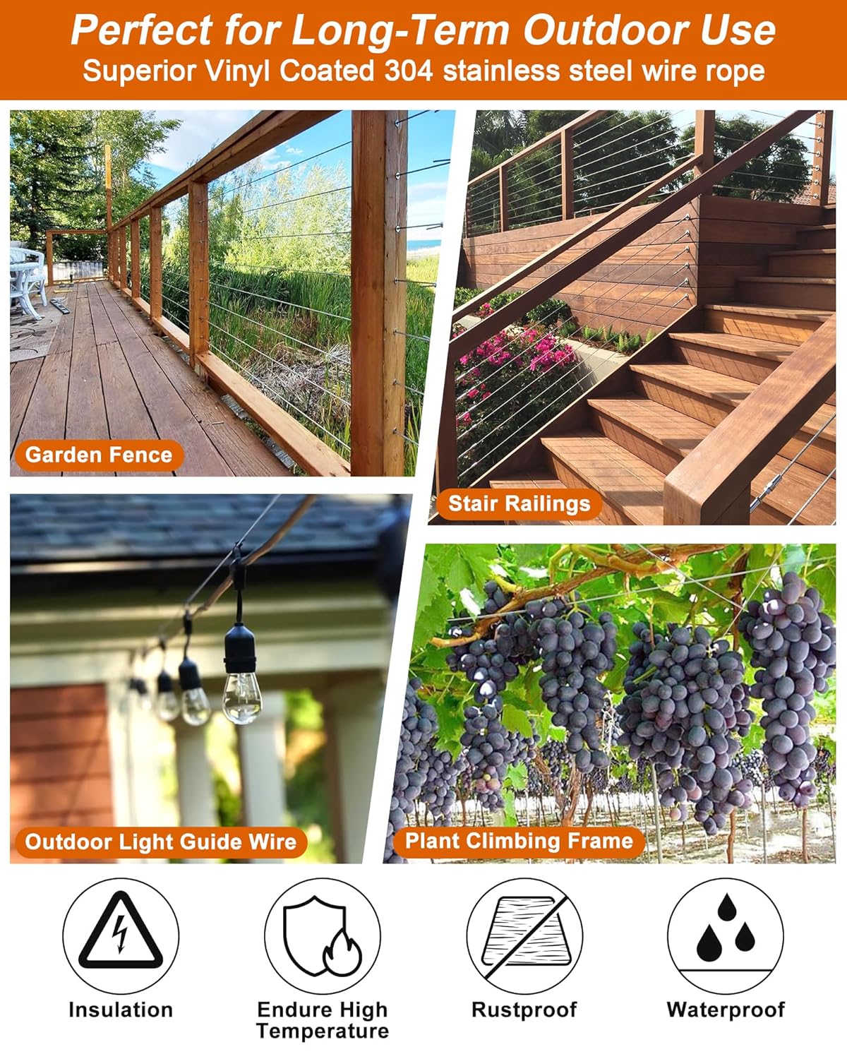 - Recommended Uses For Product : Outdoor Hanging String Lights Guide Wires, Clothes line Wire, Climbing Plants, Garden Railings, Outdoor Chandeliers, Patio Tent Ropes, Picture Displays, Canopies, Pergolas, Curtains, Deck Cable Railings, Festival Hanging Decorations Outdoor Hanging String Lights Guide Wires, Clothes line Wire, Climbing Plants, Garden Railings, Outdoor Chandeliers, Patio Tent Ropes, Picture Displays, Canopies, Pergolas, Curtains, Deck Cable Ra… See more