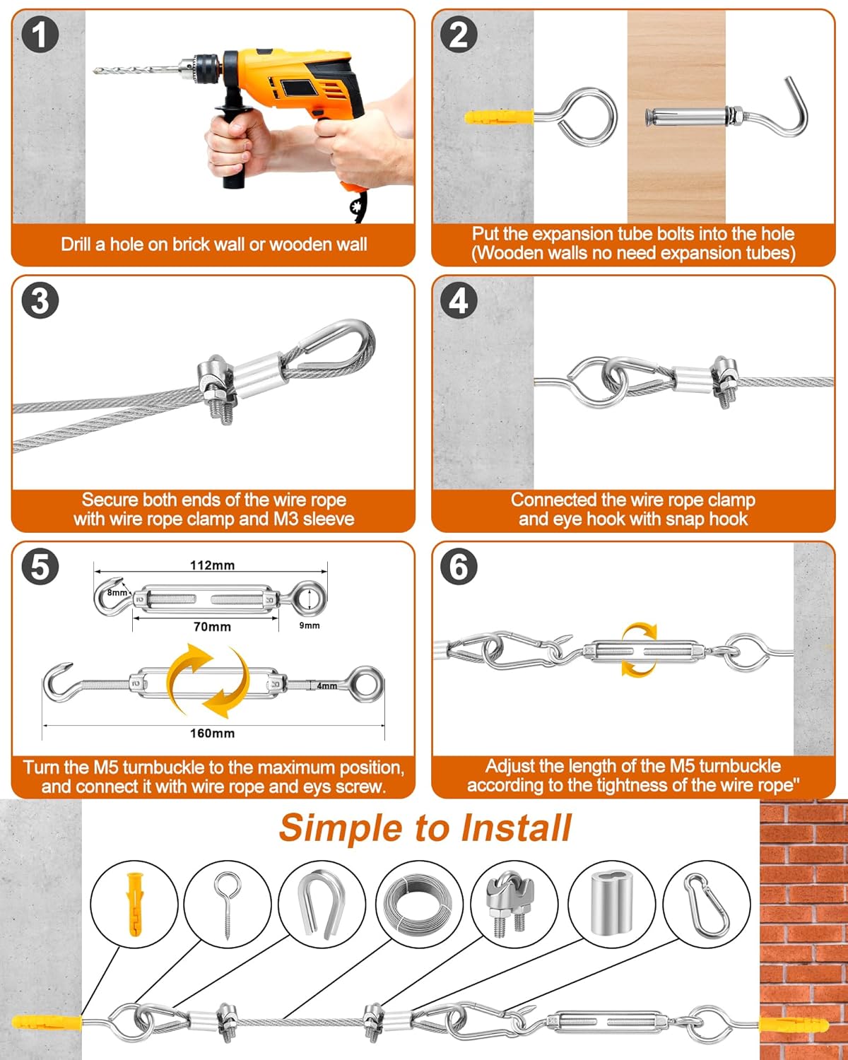 - [More Reasonable Quantity Matching] Come with 5 Pcs M5 turnbuckle tensioners, perfectly match 10 Pcs M5 eye hook screws, eliminating any concerns about accessories matching problems. If you encounter any issues with our 1/8" stainless steel cable Kit, please contact us anytime, we’re committed to protecting your rights and interests