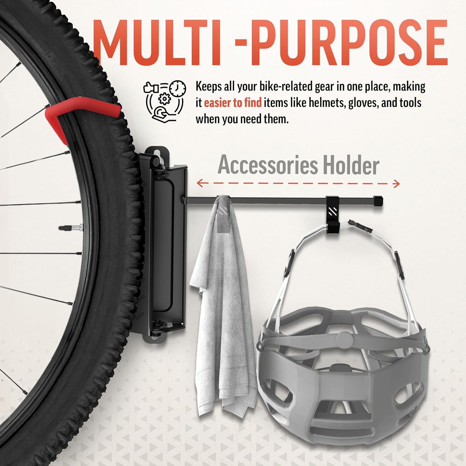 - Space Saving Design Swivels both ways to Hang Bikes Up and Out of the Way. When Not In Use, It Folds up Flat Against the Wall