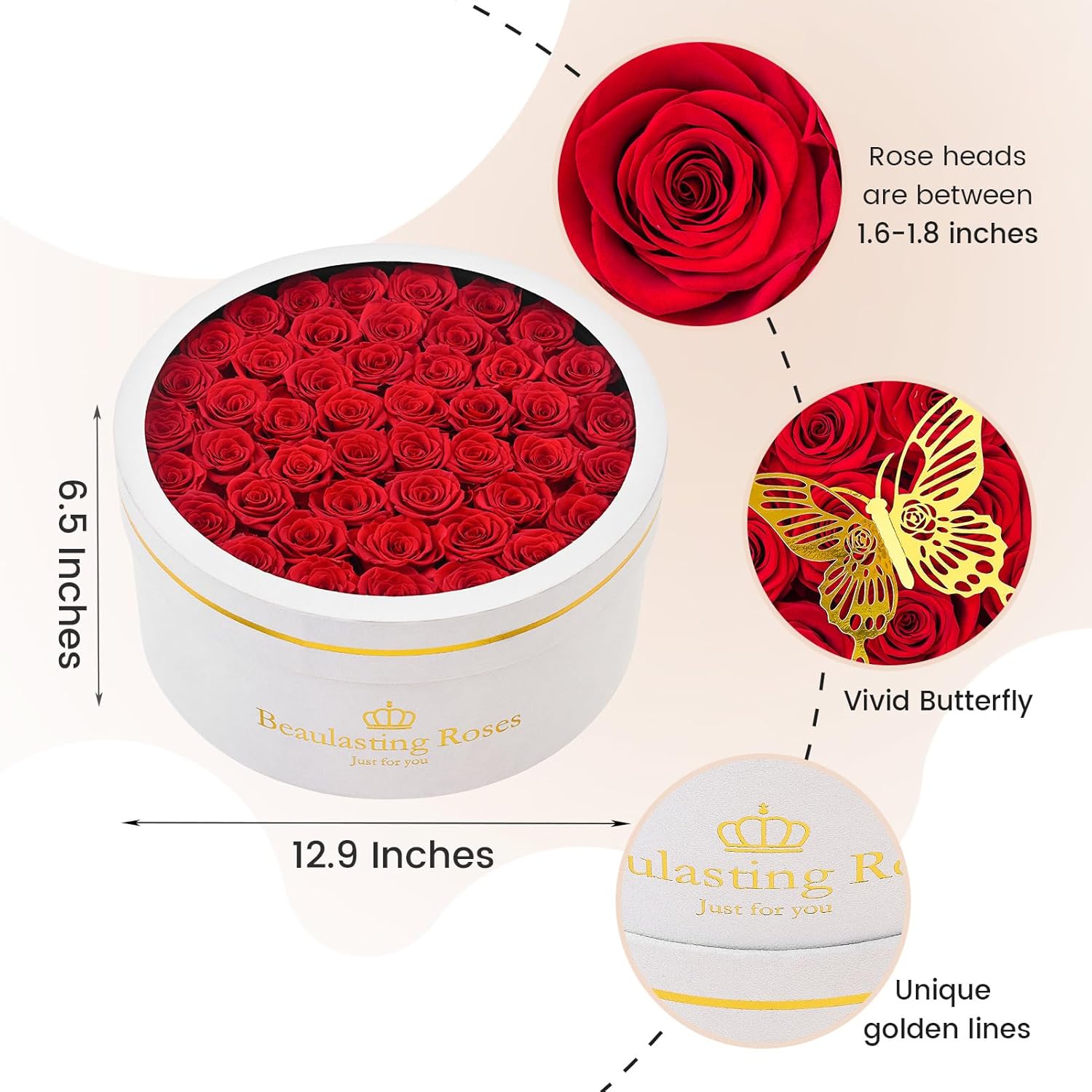 - Elegant display box: The high-quality round white velvet box feels luxurious and understated, putting all the focus on the 47-piece bright, everlasting roses - a timeless gift your loved one will enjoy for over a year. The PVC transparent cover also displays the preserved roses well