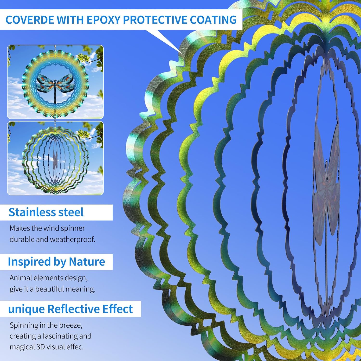 - Captivating Magical 3D Visual Effect - Cawalap Dragonfly Wind Spinner surface of the metal wind spinner is additionally coated with a unique layer of colorful reflective material, when the breeze blows, the reflective colorful glitter material gives off a sparkling, creating a fascinating and magical 3D visual effect, its beautiful light reflecting and attractive view, for balcony, garden, patio, porch, backyard, courtyard, both indoor and outdoor will beautify decor your home.