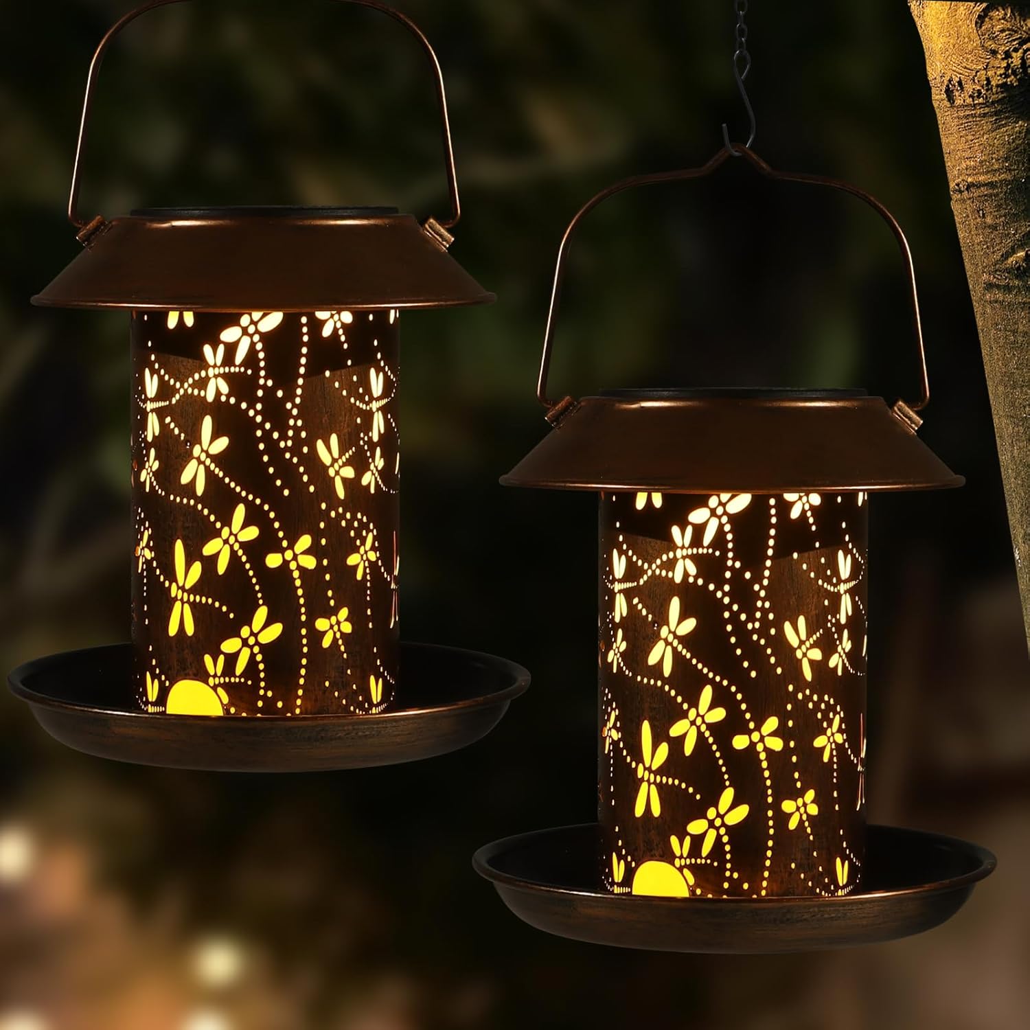 - 【Imaginative Outdoor Decor】Retro copper bird feeder, it's appearance with irregular flight track pattern, the solar light will project warm and bright light after dark, projecting the pattern of dragonfly flying on the ground. Whether placed on the ground or hunging on the tree, it's perfect for decorating gardens, patios, yards and porches.