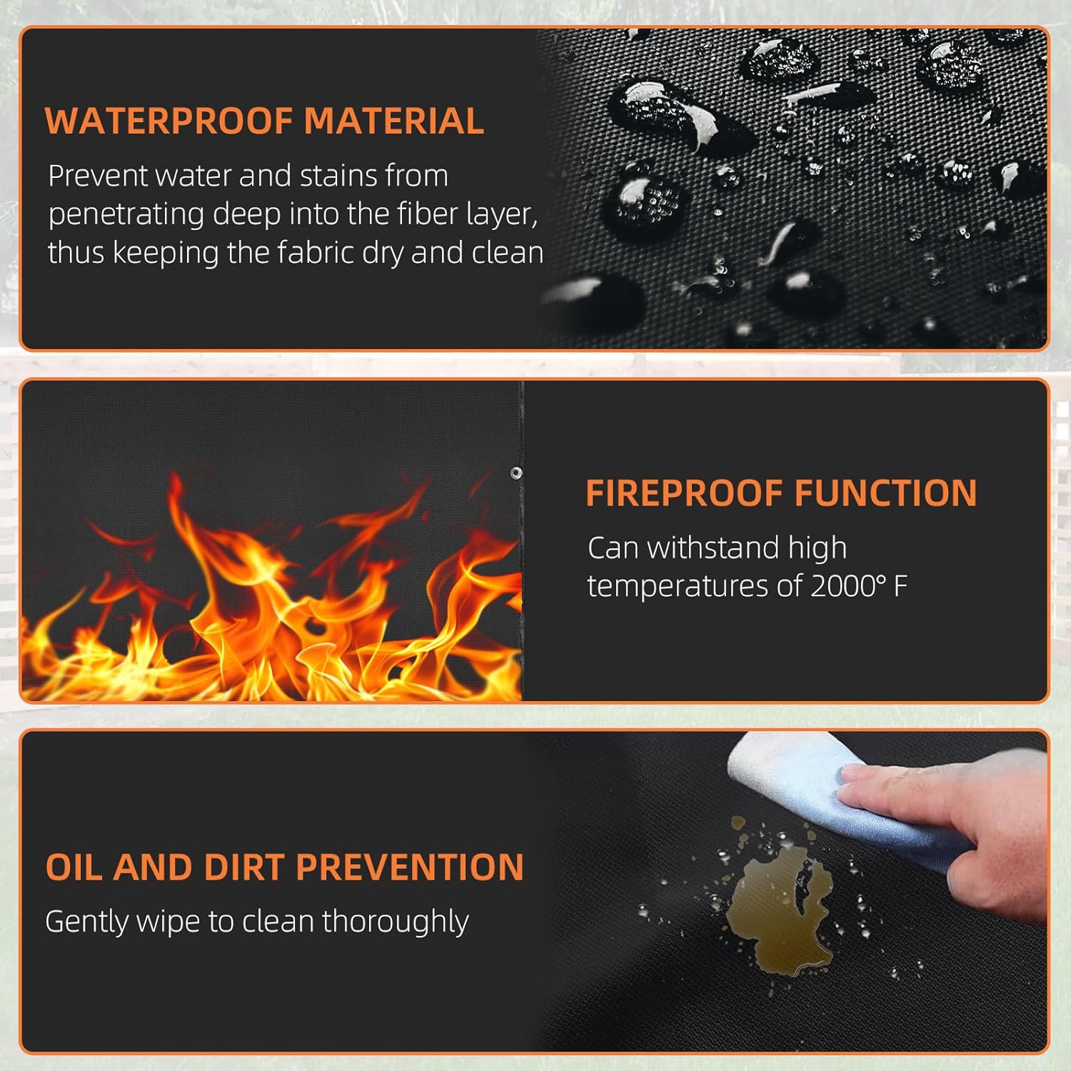 - WATERPROOF DESIGN: durable material offers complete water resistance and oil-proof protection smooth surface allows for quick cleaning simply wipe with a damp cloth or rinse with a garden hose for effortless upkeep