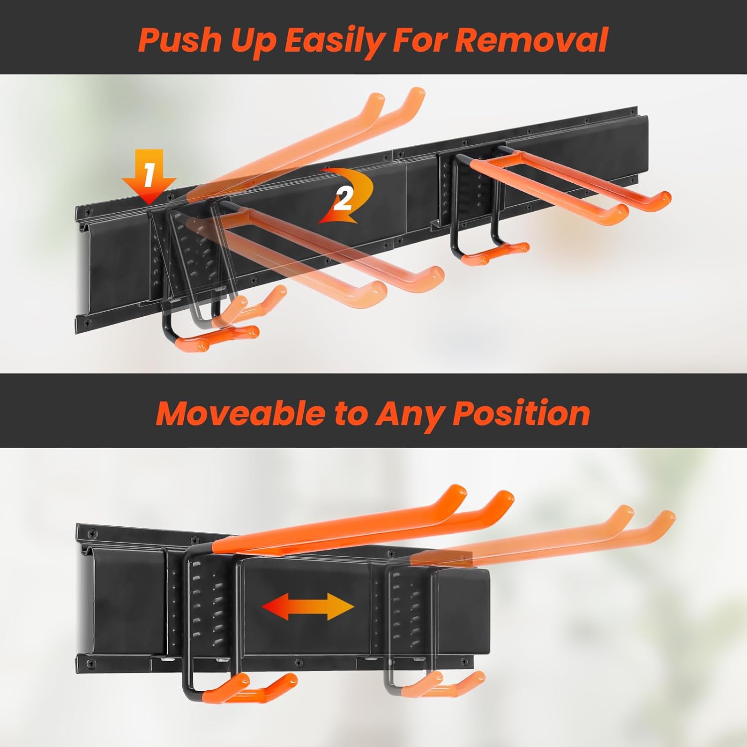 - Adjustable Garage Wall Tool Rack: With a 48-inch length, our adjustable garden tool holder wall mount organizer features 6 hooks and 3 rails to organize garage/lawn/garden tools efficiently, saving valuable floor space