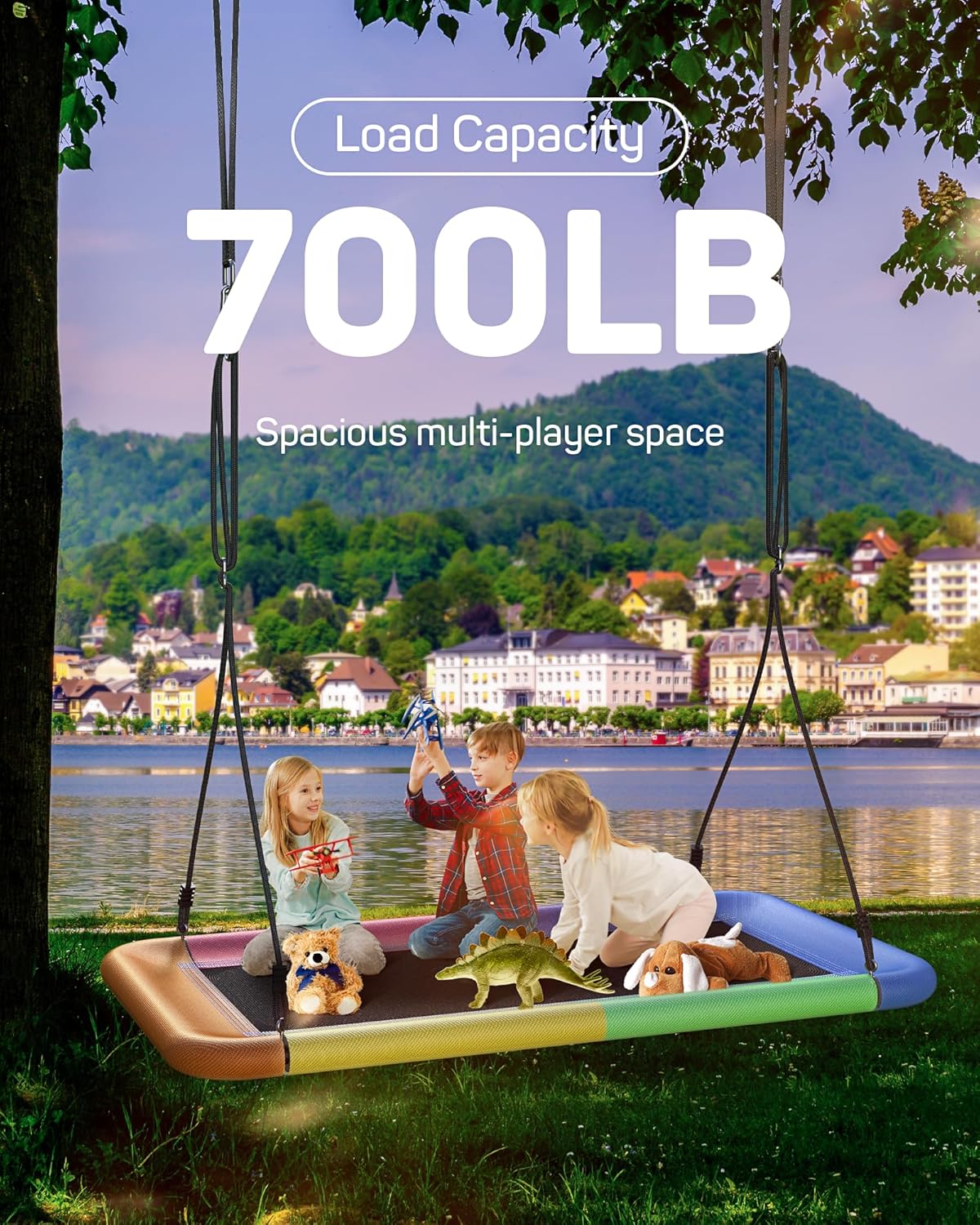 - 60" x 32" Platform Swing β 700lbs Load Capacity: Heavy-duty steel frame with tight weave Textilene fabric seat. Comfortably holds up to 4-5 kids or 2 adults. Rated for 700 pounds. Perfect for backyard, garden, or indoor use. Safer and stronger for long-time swinging.
