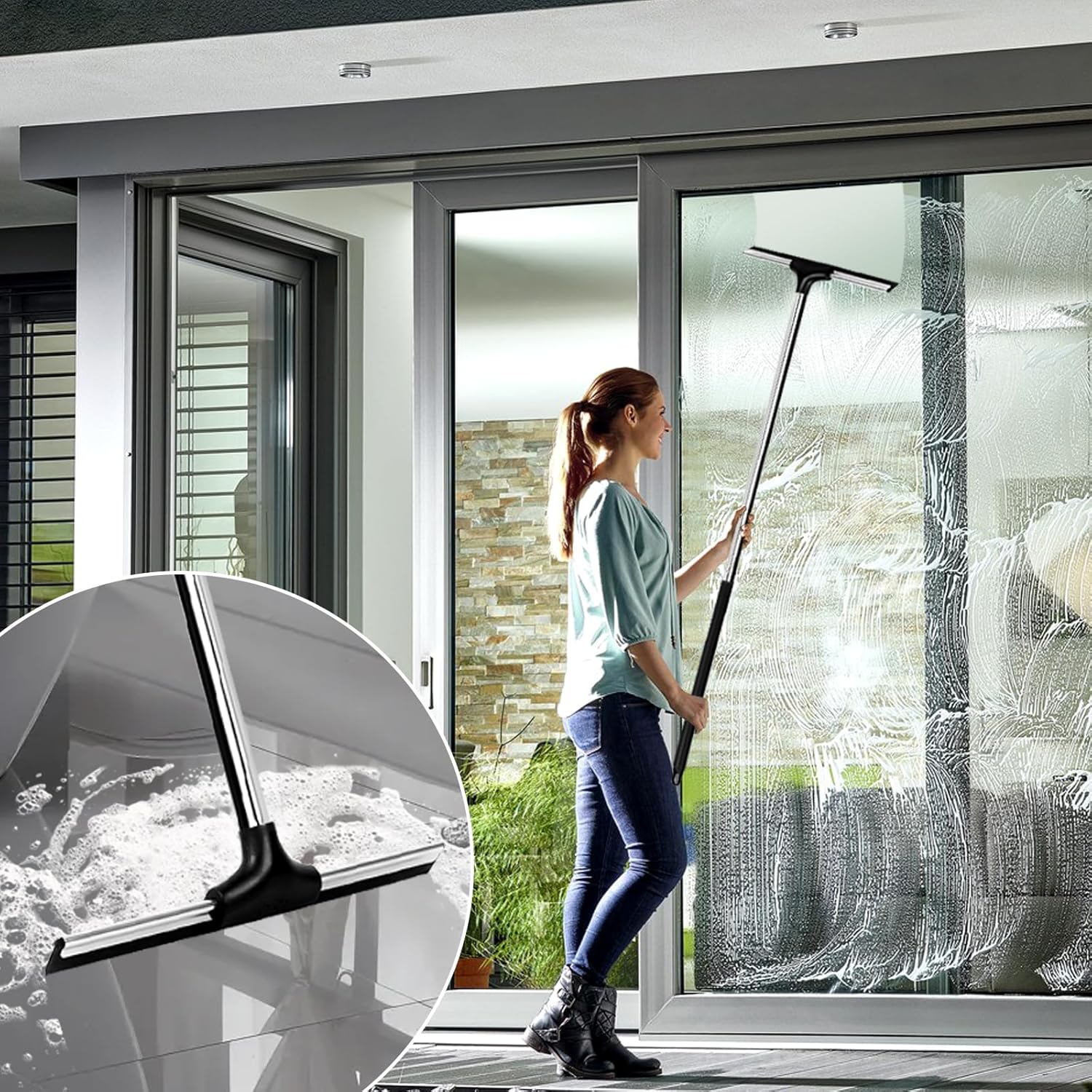 - 【No more bending while cleaning】:This rubber broom features a sturdy steel handle that can be adjusted in length from 18 inches to 59 inches by removing or adding sections, allowing you to clean easily without stressing your back, you can also easily reach windows or any high area to remove water and dirt. In addition, it has a hanging holes for easy storage.