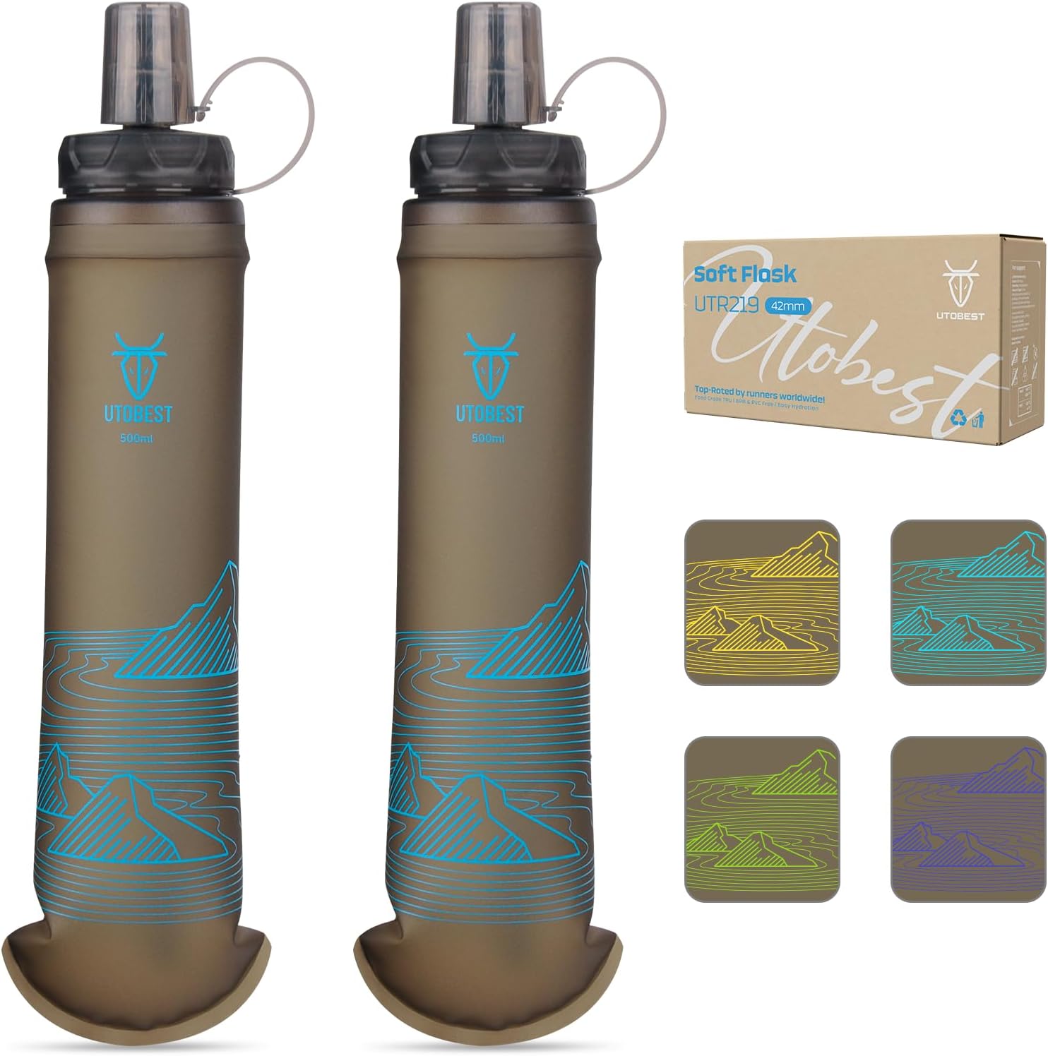 UTOBEST 500ml Soft Flask, 2 Pack Flexible TPU Hydration Water Bottle, Collapsible with 42mm Caliber for Running, Hiking, Cycling, Climbing, and Marathon Blue