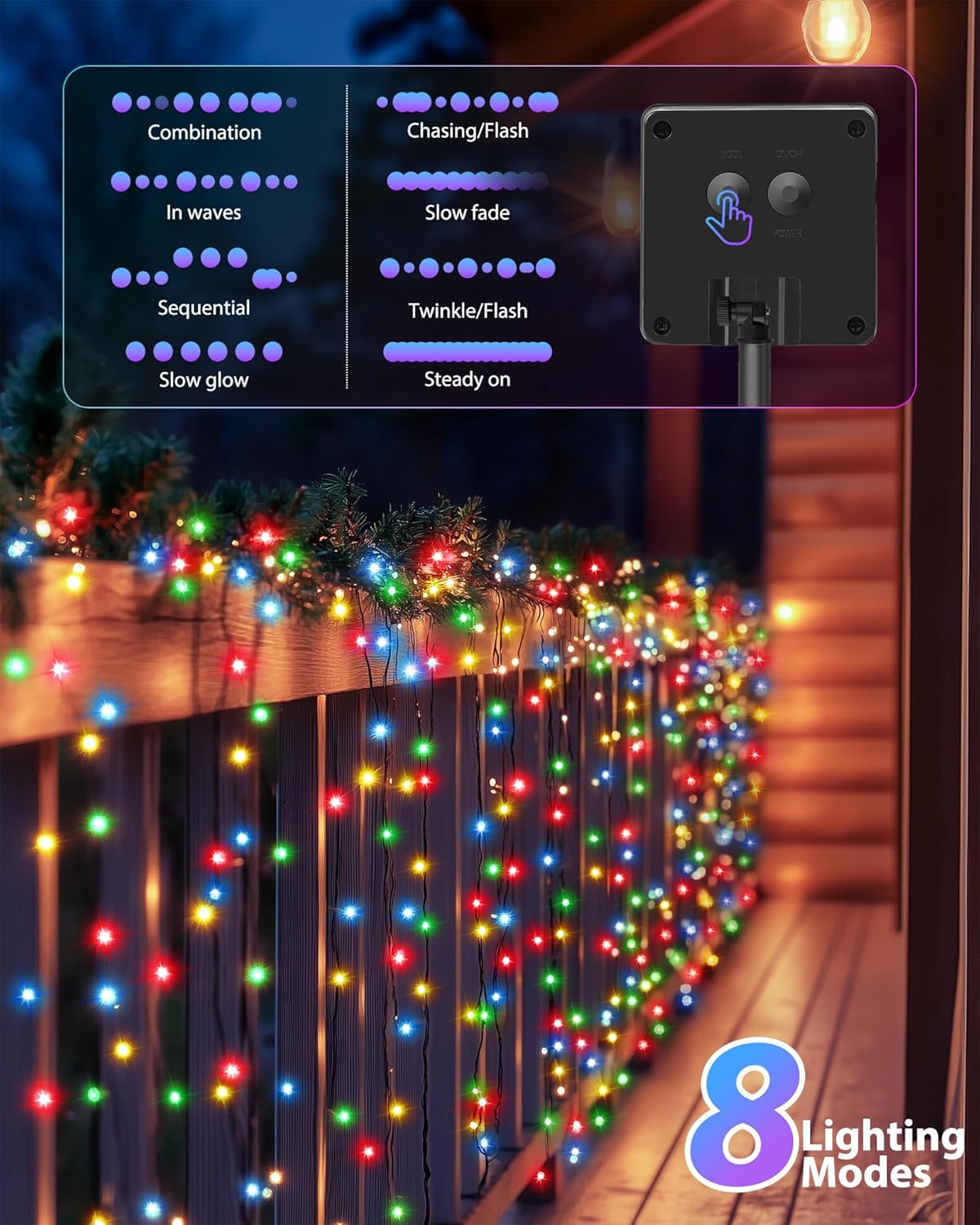 - ă8 Modes & Memory FunctionăIncluding combination, waves, sequential, slow glow, chasing/flash, slow fade, twinkle/flash, and steady on. You can be adjusted by the "mode" button behind the solar panel to satisfy your diverse needs, it also has a memory function and no need to reset it daily.