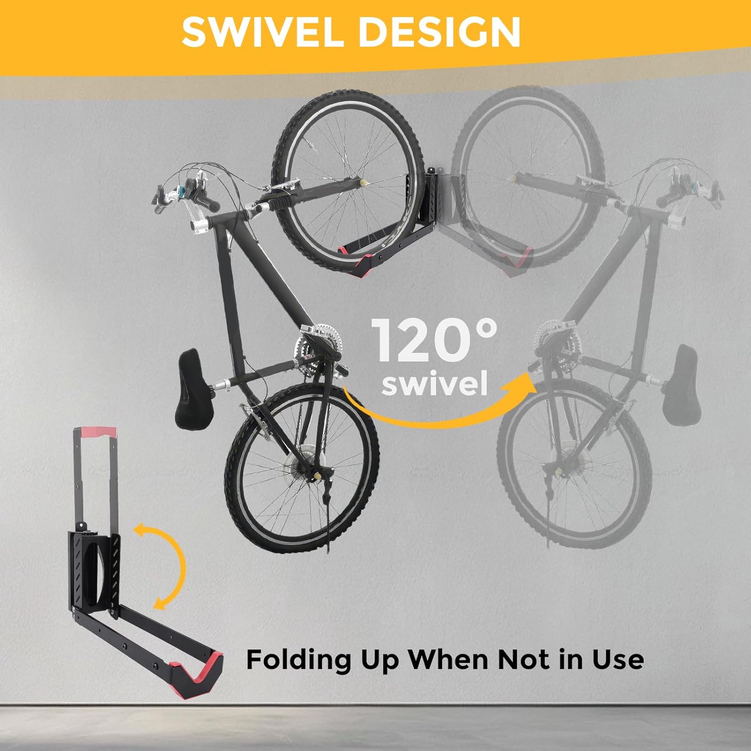 - 120Β° SWIVEL DESIGN: The swivel bike rack features a unique 120-degree pivot function that efficiently frees up your floor space whilst maximizing wall utilization. Our swivel design facilitates easy loading and unloading of bikes by smoothly rotating left and right.