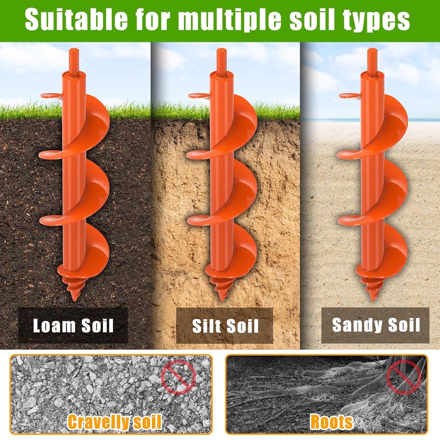 - πΊπππ&ππππππ ππ πΌππ: Each garden auger drill bit has no sharp edges, the 3mm thick helix makes it super easy and quick to drill a a 3'' hole that will cut through clay, tough mud, sand, dirt and deals with rocks pretty well.