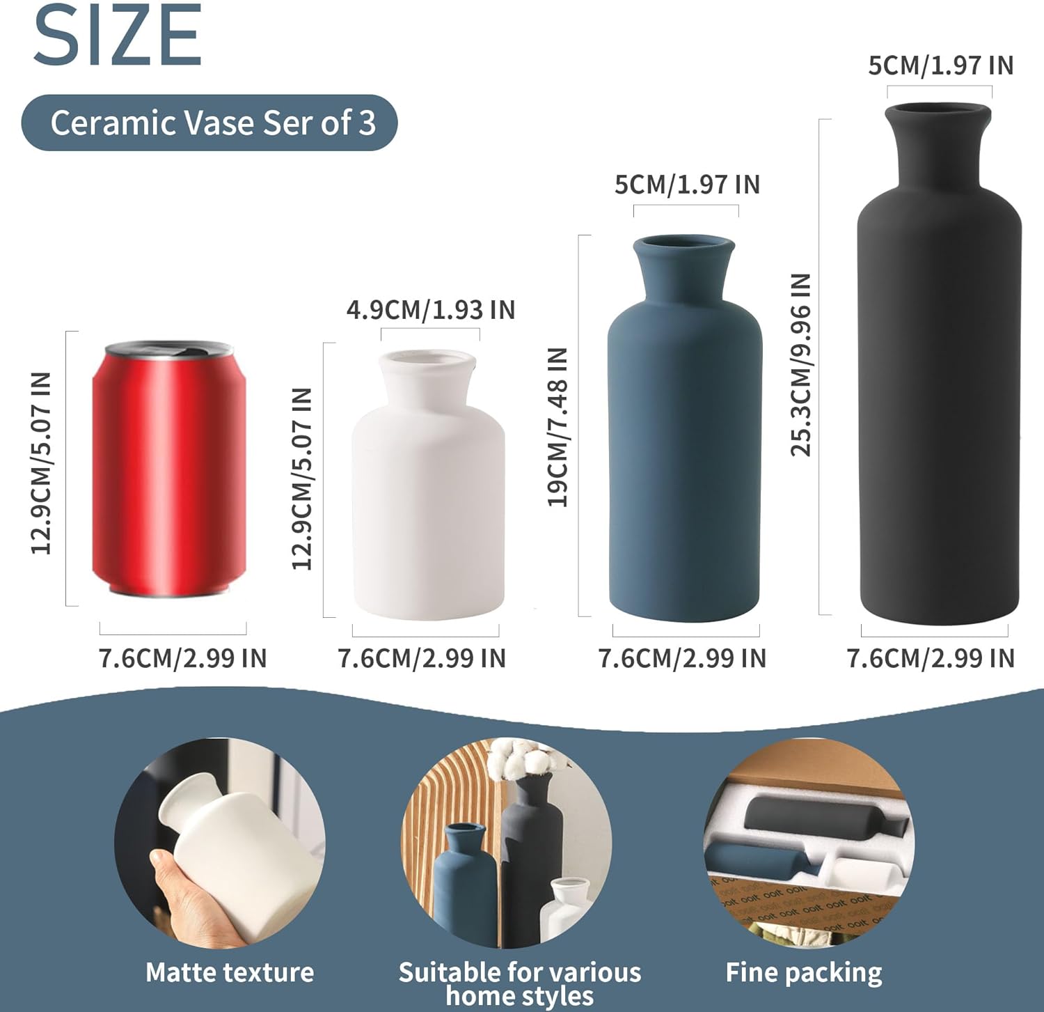 - 【For Multiple Home Décor Styles】Designed in a variety of shapes and sizes, this set of vases is the perfect home décor even without flowers. Whether your style is bohemian, modern farmhouse, rustic, or homey, they all fit in perfectly show off your lifestyle and decorative sense of style. (Length X Diameter=10X3.15", 7.28X3.15",5.12X3.15").