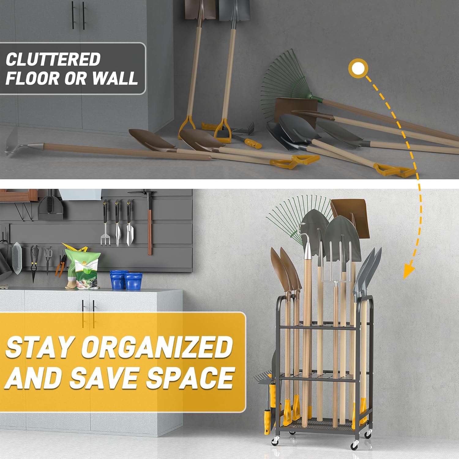 Ultrawall Garden Tool Organizer Stand, Yard Tool Storage Rack with Lockable Wheels, Garage Tool Storage for Rake, Brooms, Indoor & Outdoor Use